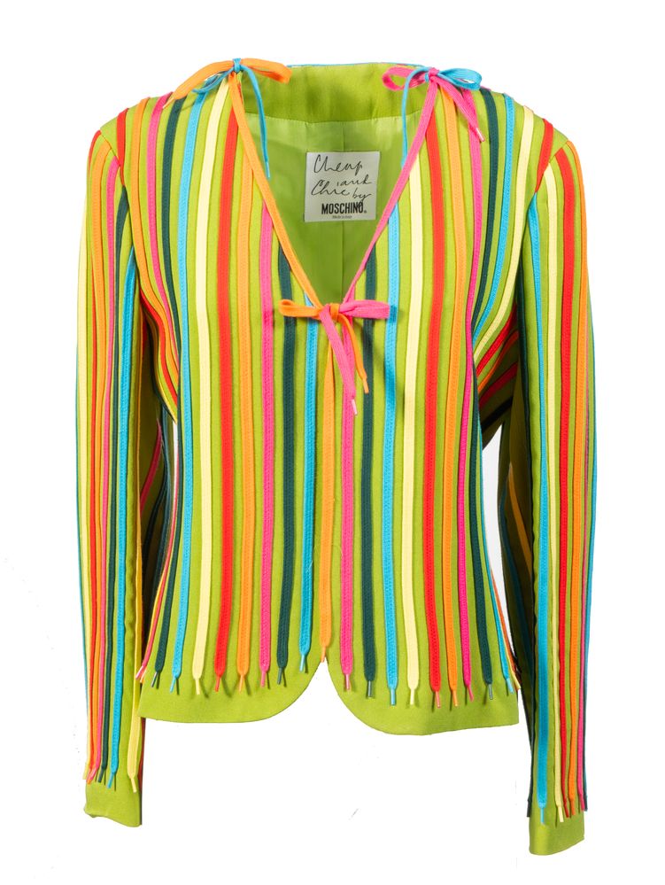 MOSCHINO Cheap and Chic Giacca sui toni del verde con applicazioni di lacci da scarpe multicolore. Chiusura con fiocco realizzato in lacci da scarpe. Anni '80. Riporta taglia IT 44 - FR 40. Composizione esterno: 79% acetato e 21% rayon. Composizione fodera interna: 60% acetato e 40% rayon. Reca etichetta Cheap and Chic By Moschino Made in Italy.