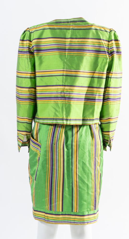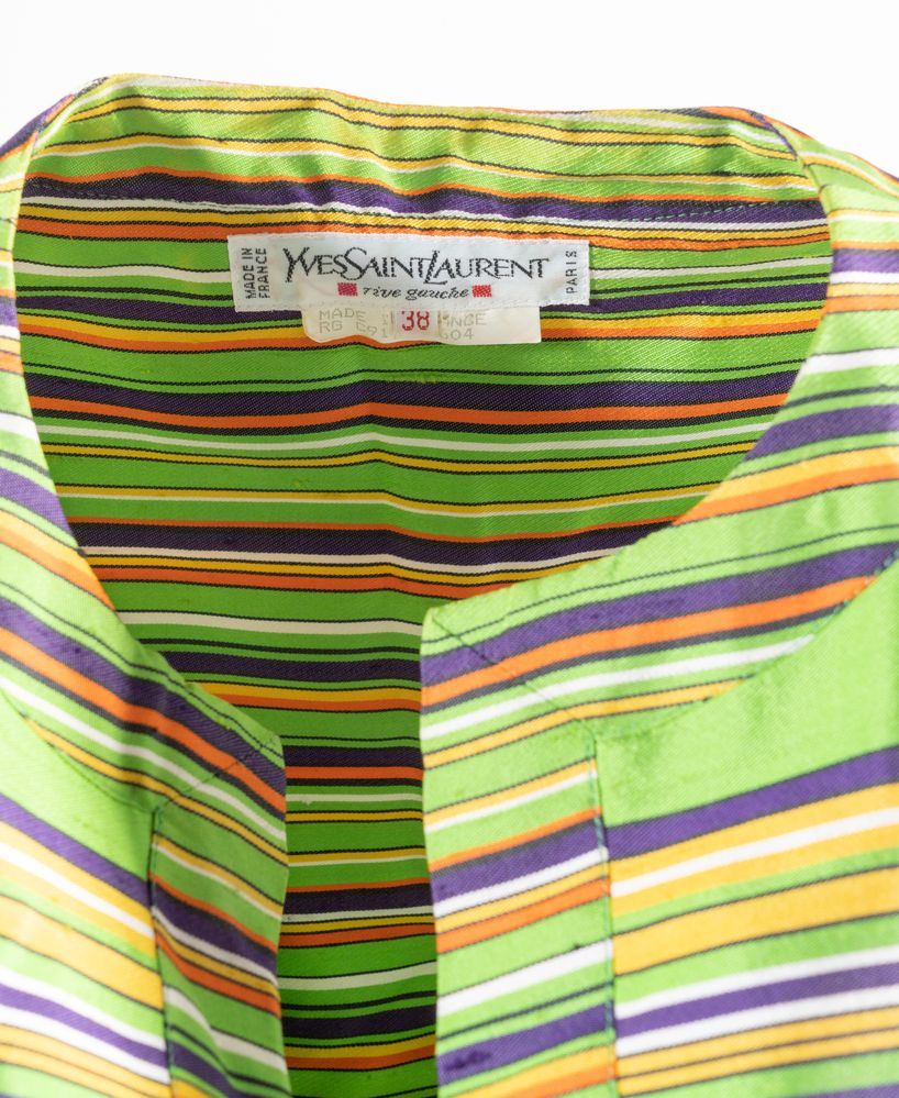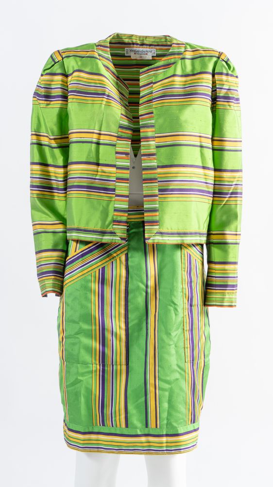 YVES SAINT LAURENT Rive Gauche Tailleur composto da giacca e gonna a fantasia a righe sui toni del verde, del giallo, dell'arancione e del marrone. Riportano taglia 38. Recano etichetta Yves Saint Laurent Rive Gauche Made in France. (Difetti)