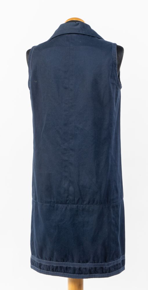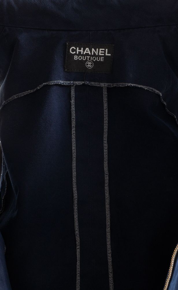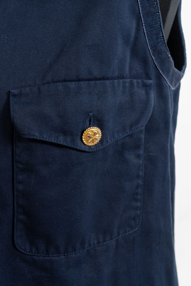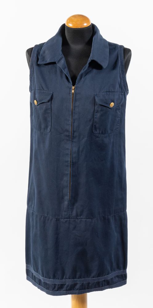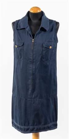 CHANEL Abito in tela blu notte con dettagli in metallo dorato. Taglia non riportata: IT 42 circa. Reca etichetta Chanel Boutique. (Lievi difetti)