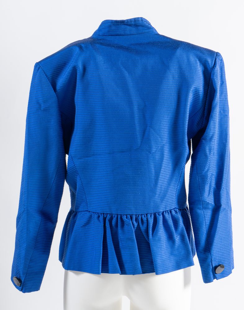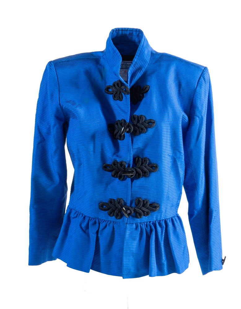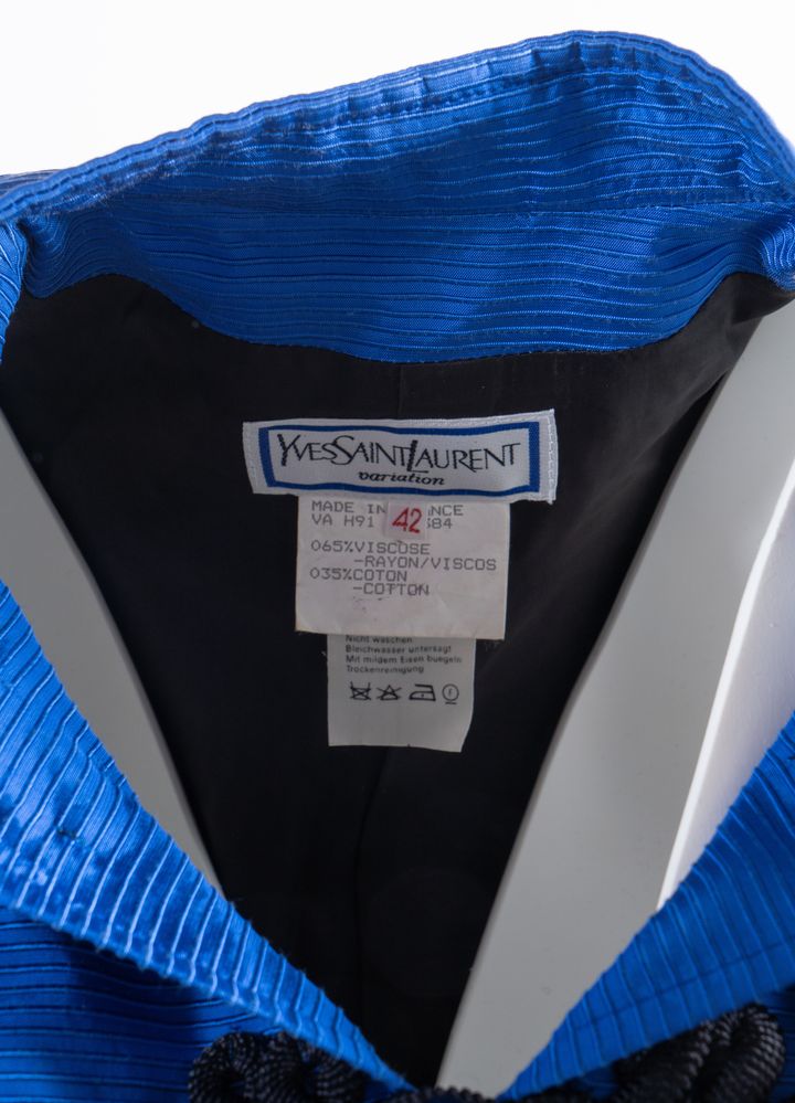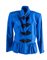 YVES SAINT LAURENT Variation Giacca sui toni del blu elettrico con chiusura con alamari neri e colletto alla coreana. Riporta taglia 42. Composizione: 65% viscosa e 35% cotone. Reca etichetta Yves Saint Laurent Variation Made in France. (Difetti)