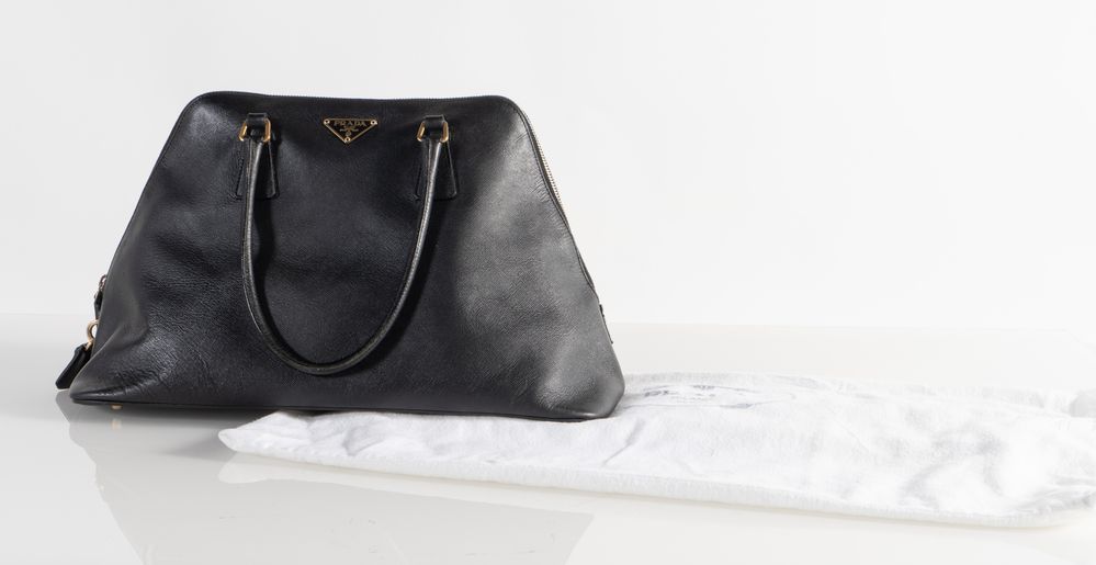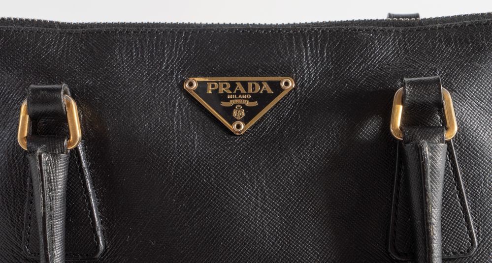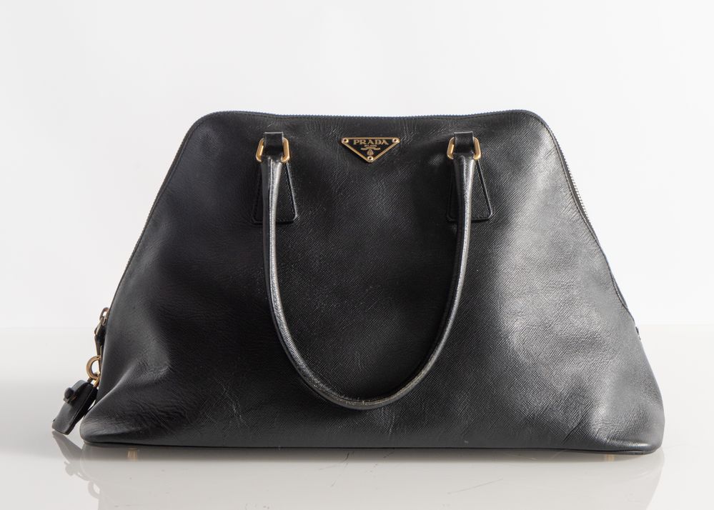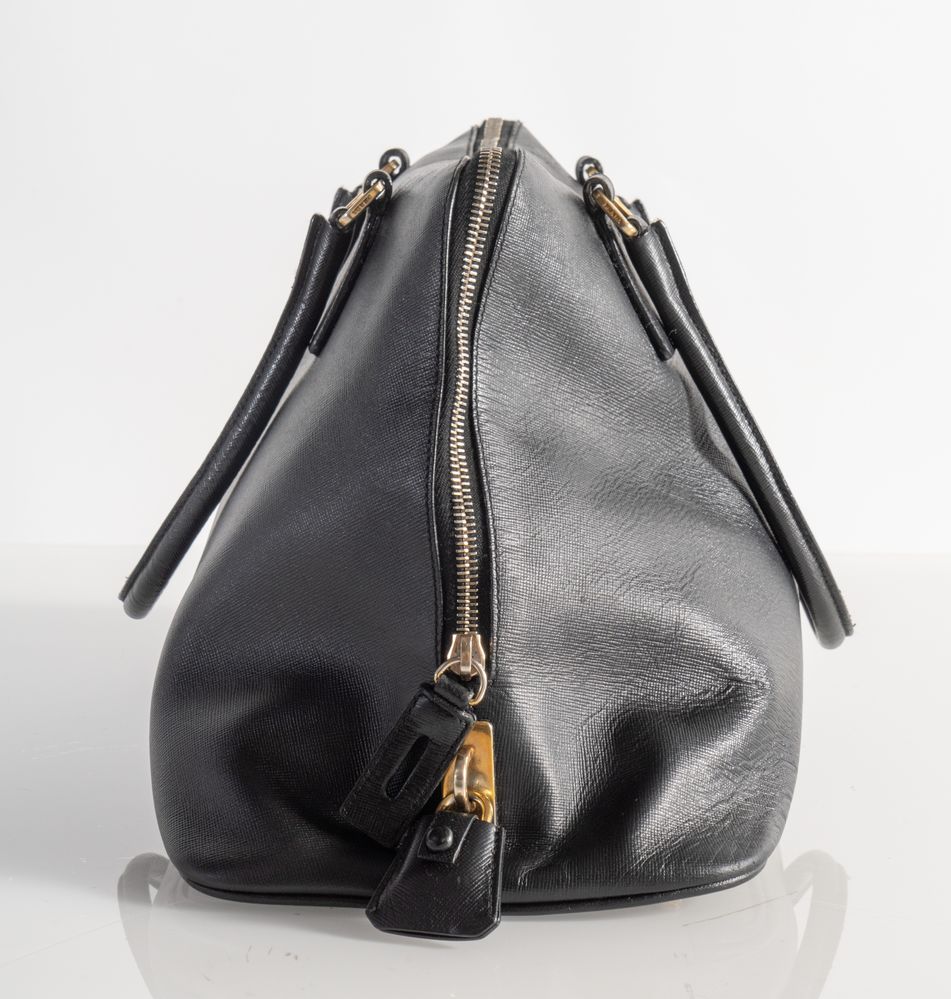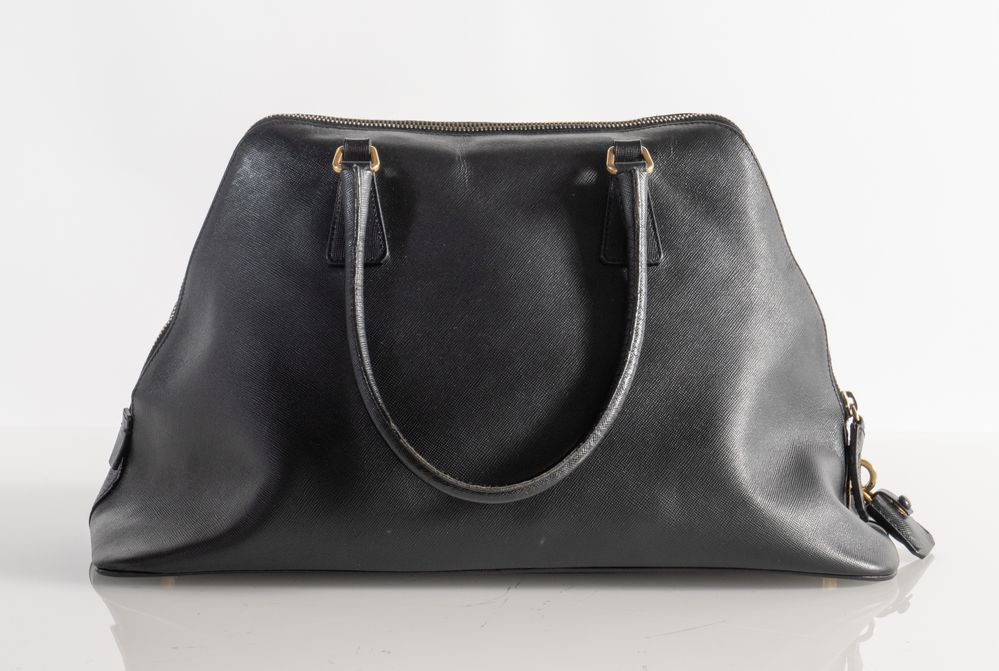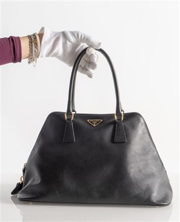 PRADA Borsa modello Promenade in pelle saffiano nera. Anni 2000. Dettagli in metallo dorato. Cm 23x38x18; manici cm 18. Reca marchio Prada Milano e codice di riferimento prodotto. Corredata di dustbag originale. (Difetti)