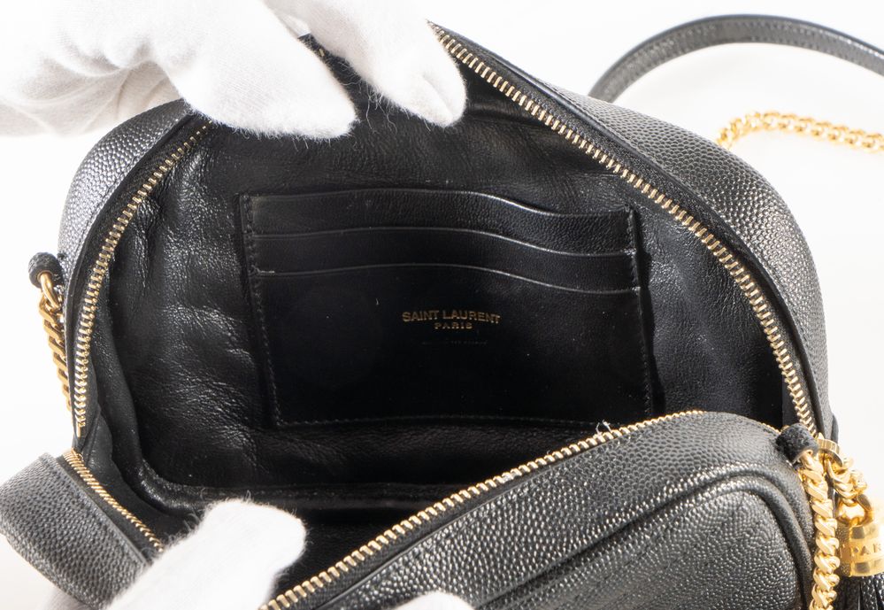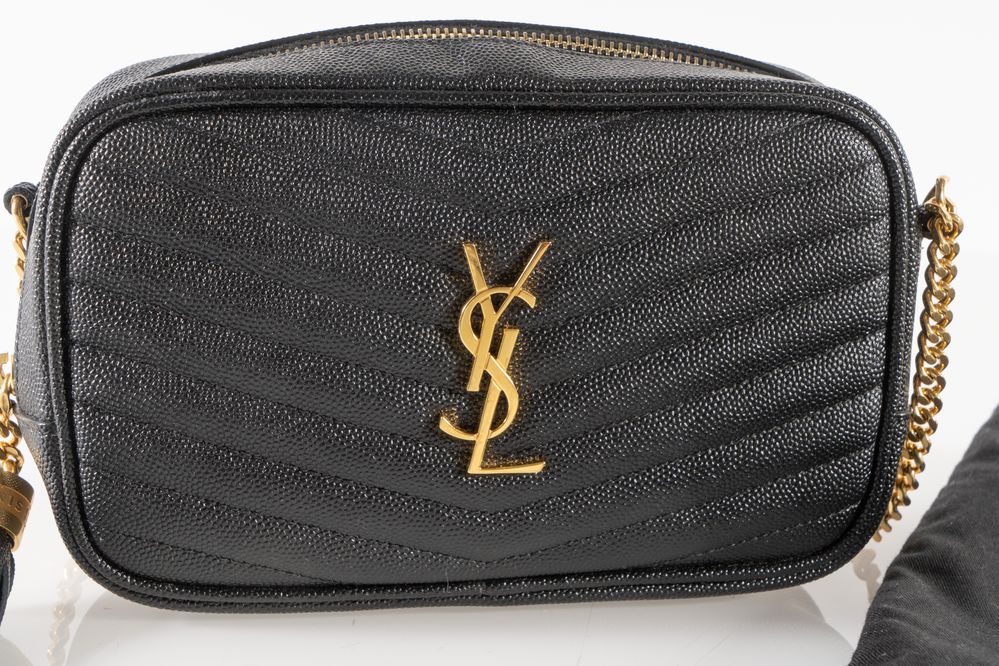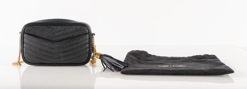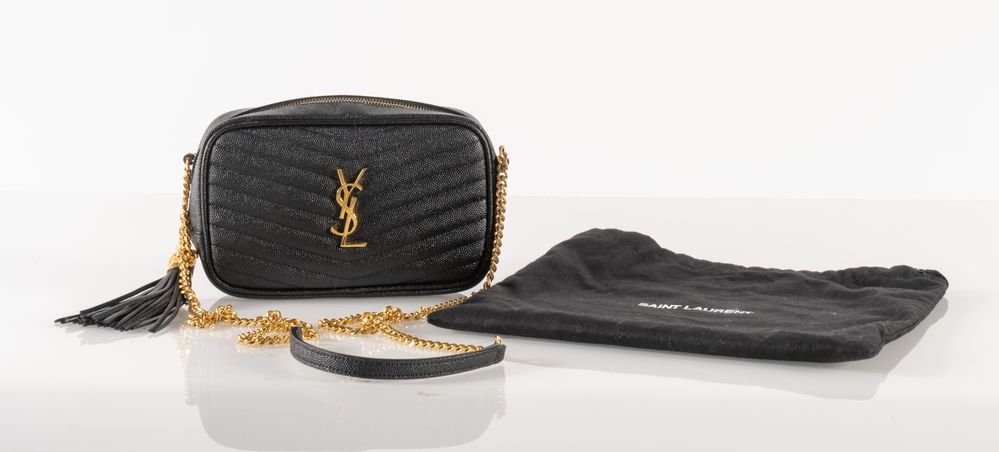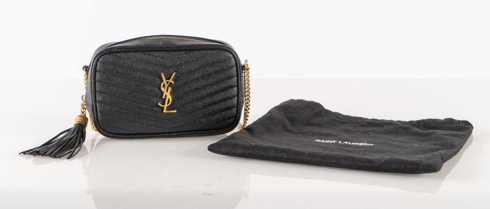SAINT LAURENT Borsa a tracolla modello Lou Mini in pelle di vitello nera matellasé con dettagli in metallo dorato e chiusura con nappina in pelle. Cm 12,5x20. Altezza con manico: 67. Reca una tasca porta oggetti sul lato esterno posteriore. Interno in pelle nera con scomparti porta carte di credito. Reca marchi YSL, Saint Laurent Paris YS, Saint Laurent Made in Italy e codice di riferimento prodotto. Corredata di dustbag originale. (Lievi difetti)
