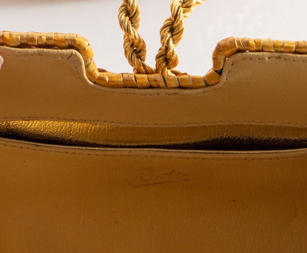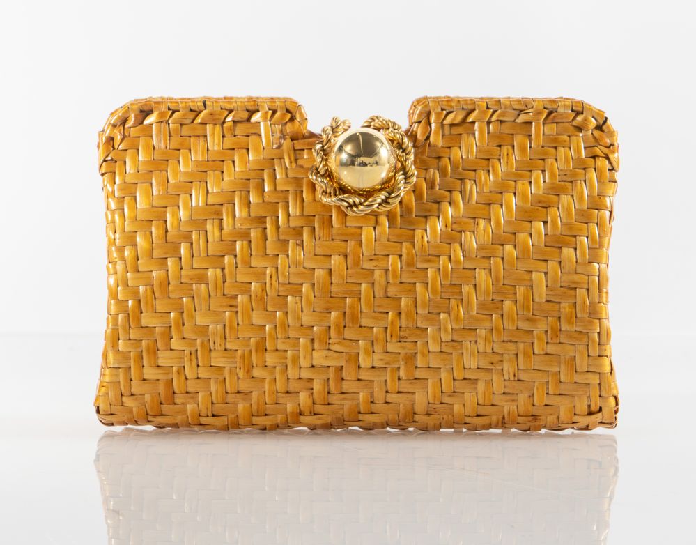 RODO Lotto composto da borsa a secchiello e pochette in vimini sui toni del beige con dettagli in metallo dorato. Internamente rivestite in pelle beige. Cadauna di cm 38x25x20 e cm 13x18x6. All'interno recano marchio Rodo Italy. (Difetti e lievi difetti)