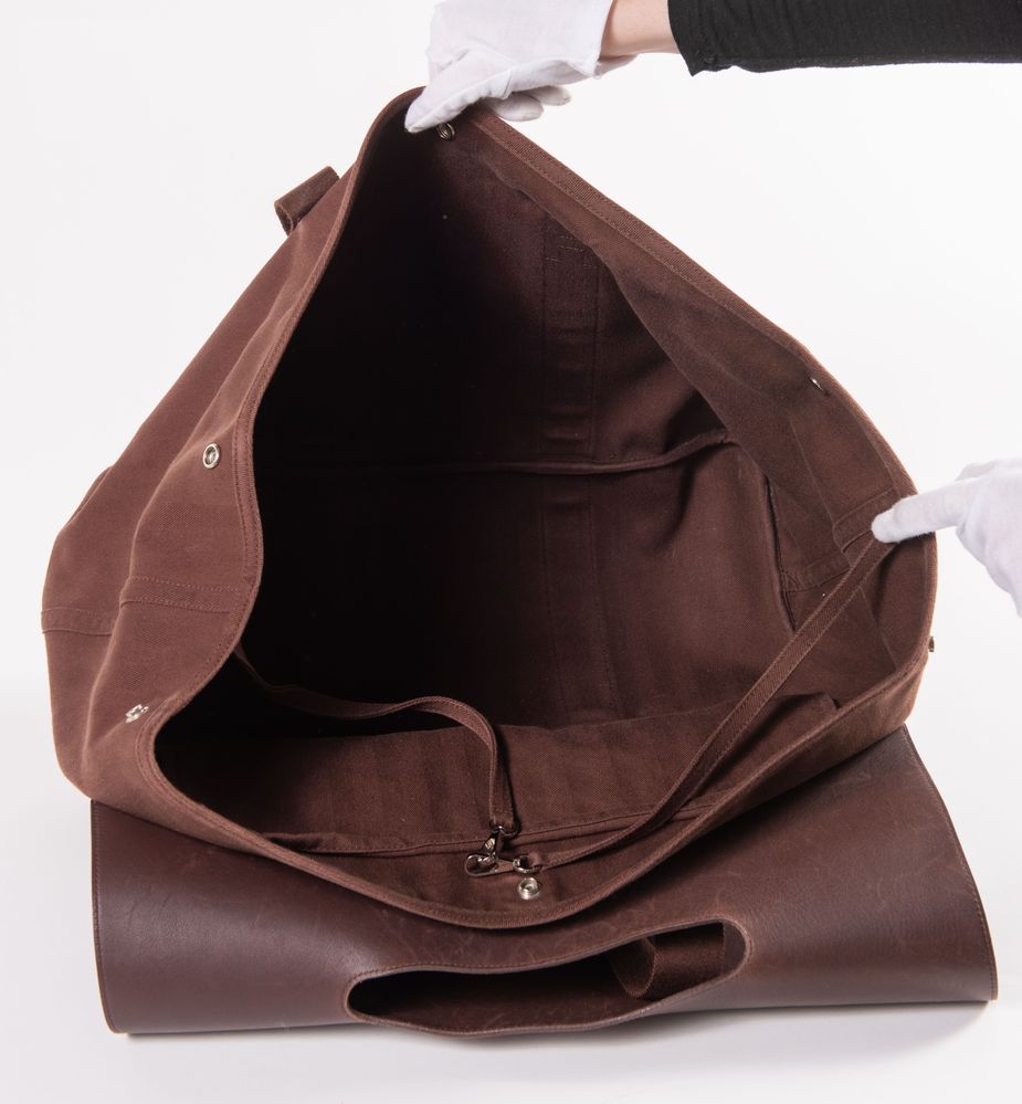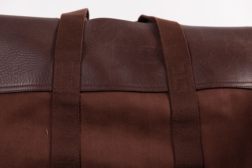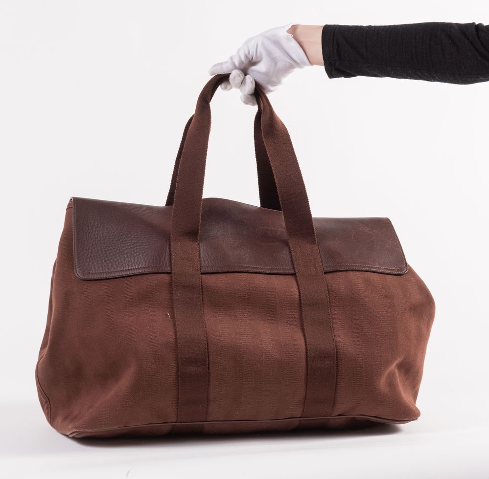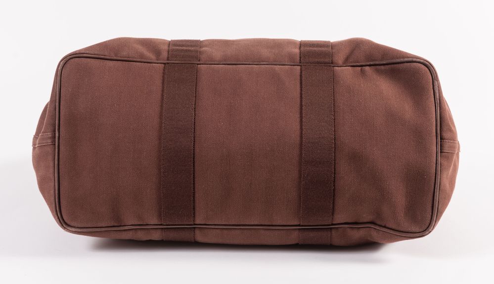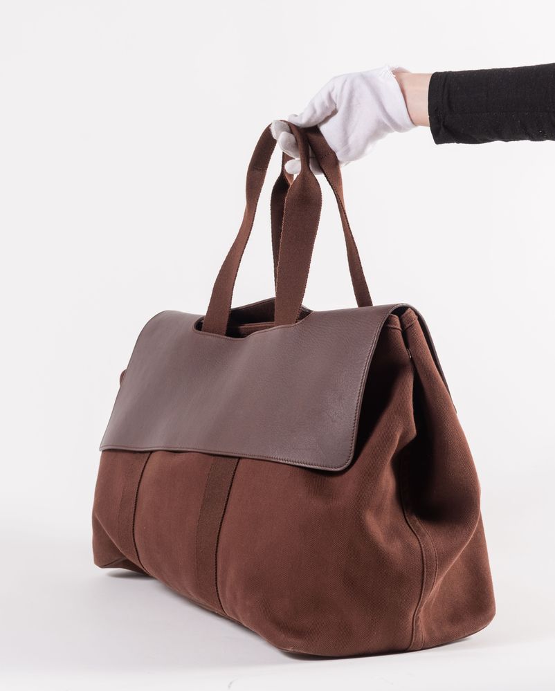 HERMÈS Grande borsa da spalla modello Valparaiso marrone in tela con rifiniture in pelle e dettagli in metallo argentato. Cm 37x51x24. Altezza con manico: cm 54. Interno rifinito in tela marrone con una tasca porta oggetti e annesso borsellino in tela coordinato. Reca marchi Hermès Paris, H. Corredato di dustbag originale. (Difetti)