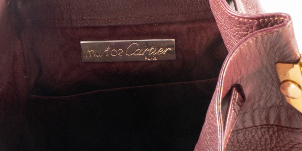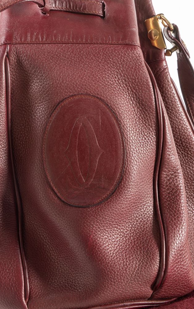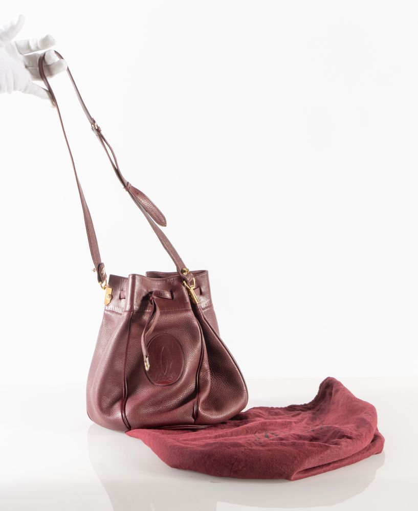 MUST DE CARTIER Borsa a secchiello modello Seau in pelle bordeaux con dettagli in metallo dorato. Cm 30x23x21. All'esterno reca logo Cartier. All'interno reca marchio Must De Cartier Paris. Corredata di dustbag originale. (Difetti)