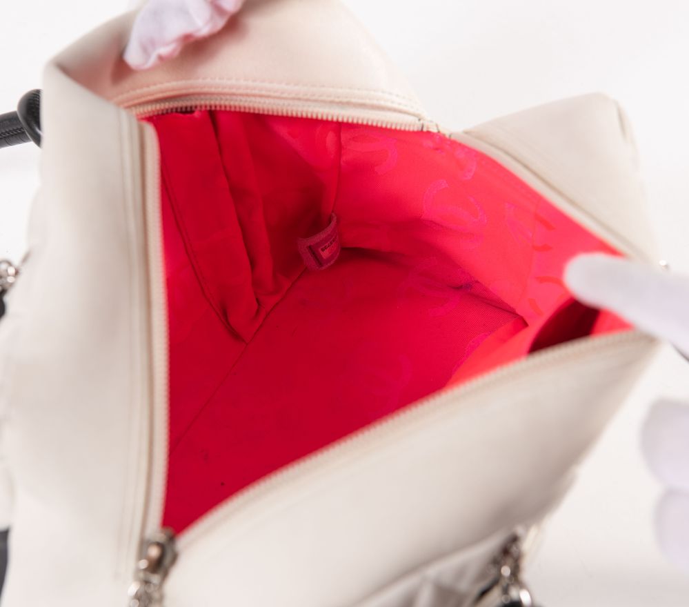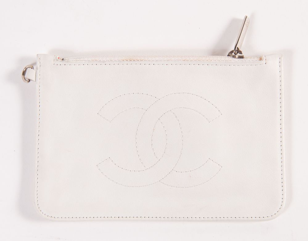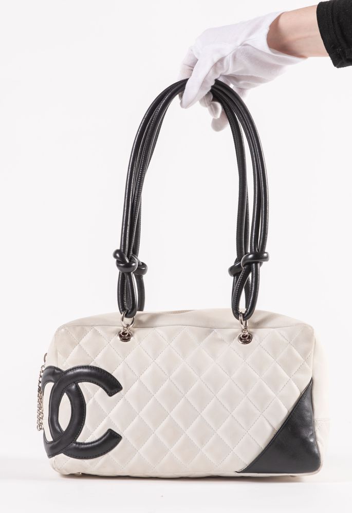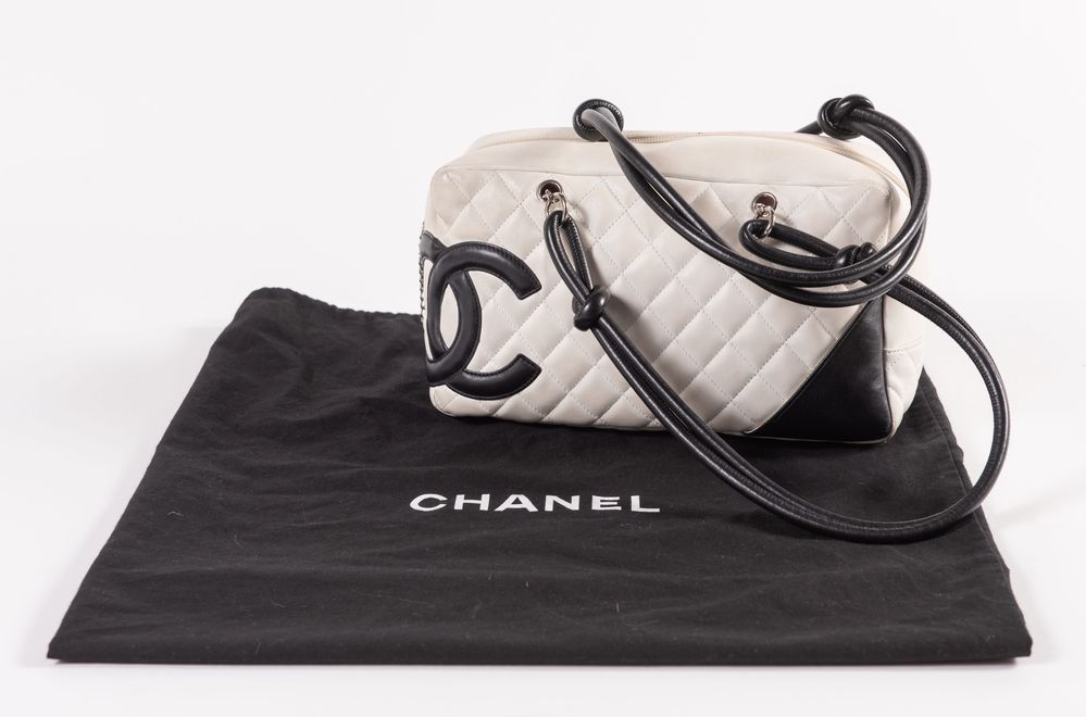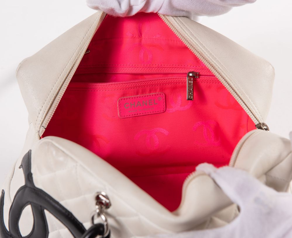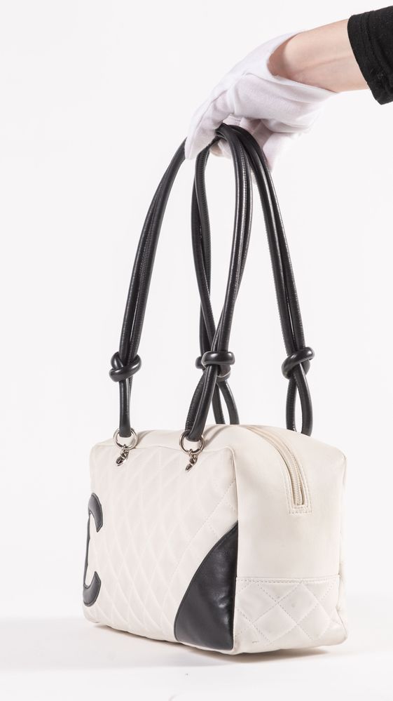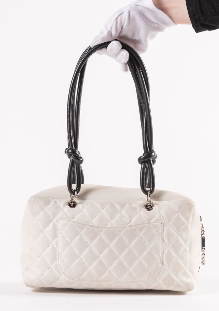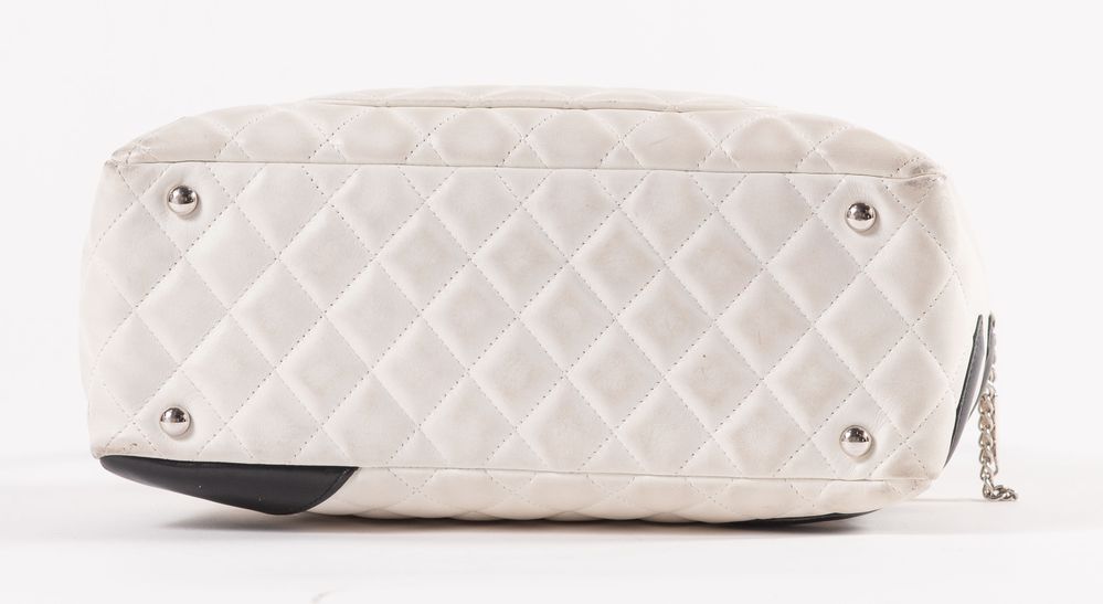 CHANEL Borsa da spalla modello Large Rectangle in pelle trapuntata bianca con dettagli in pelle nera e rifiniture in metallo argentato. Collezione Cambon 2005. Cm 19x29x13. Altezza con manici: cm 42. Interno rifinito in tela logata fucsia con tre tasche porta oggetti di cui una chiusa da cerniera e annesso borsellino coordinato in pelle bianca. All'esterno sul lato posteriore reca tasca porta oggetti. Reca marchi Chanel, CC e Chanel Made in France e codice di riferimento prodotto. Corredata di carta di autenticità e dustbag originale. (Difetti)