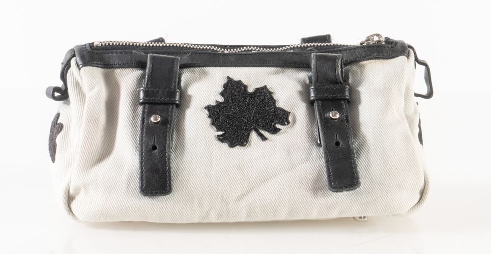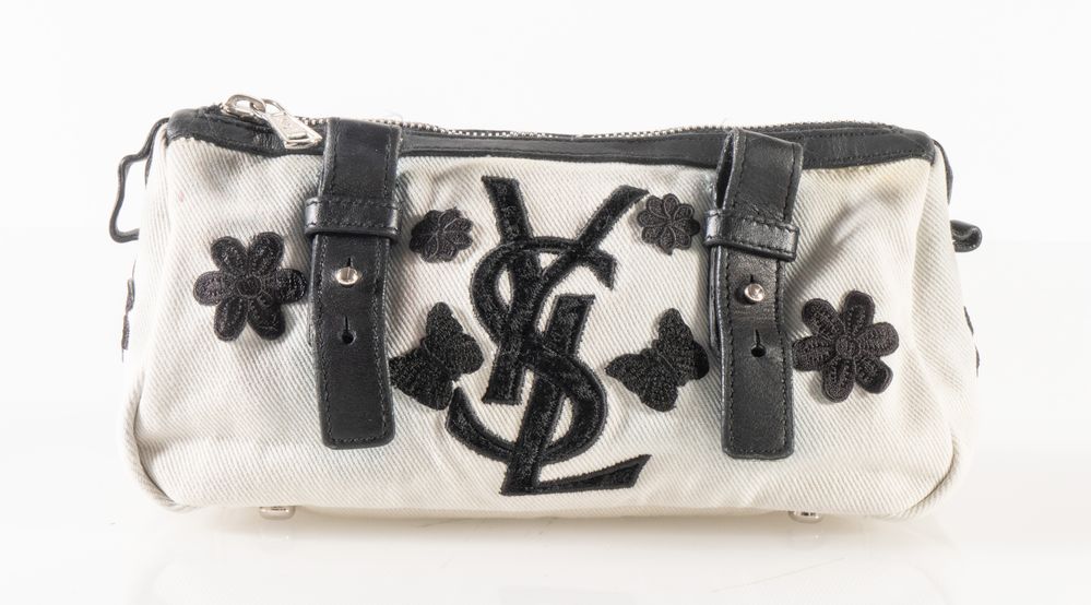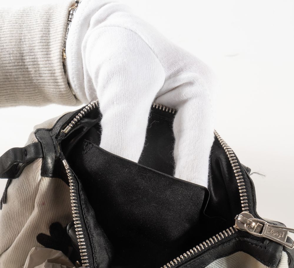 YVES SAINT LAURENT Borsa modello Kahala Mini Boston in tela bianca con rifiniture in pelle nera e dettagli in metallo argentato. Cm 13x21x8. Interno rifinito in tela nera con una tasca. Reca marchi YSL e Yves Saint Laurent Rive Gauche. (Difetti e mancanze)