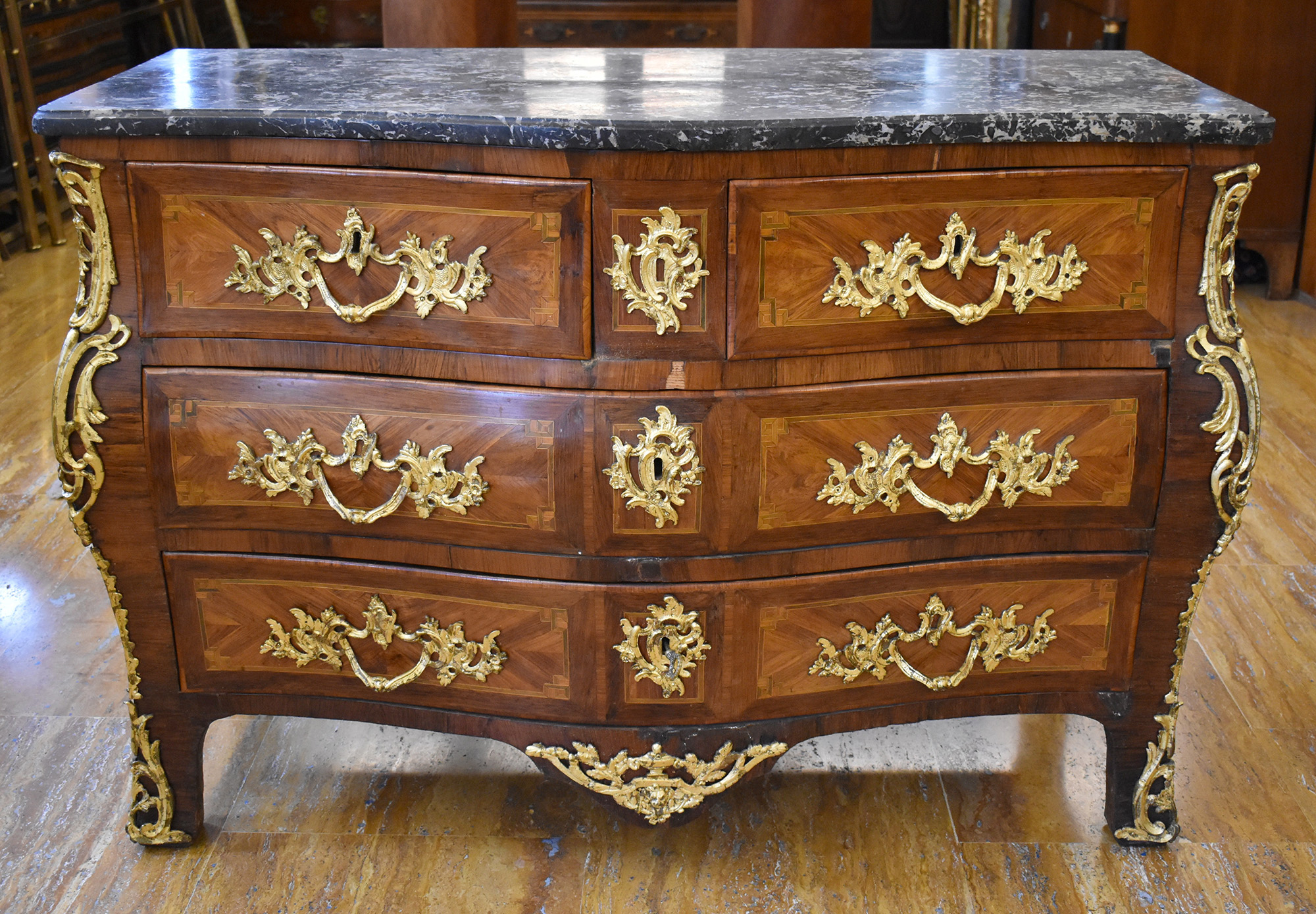 cassettone mosso sul fronte e sui fianchi lastronato in legni vari piano in marmo Francia sec.XIX
