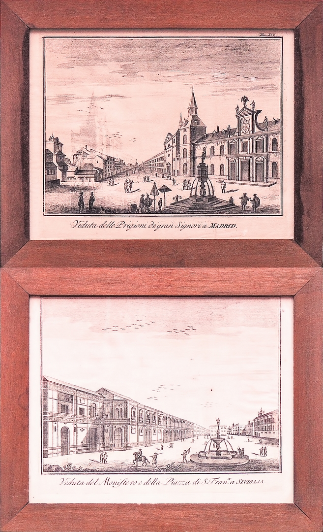 TRE VEDUTE DI CITTÀ SPAGNOLE serie di tre antiche incisioni, in cornice, cm 17x20,5