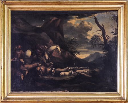 SCUOLA LOMBARDA DEL XVIII SECOLO Scorcio di sentiero con pastori ed armenti olio su tela, in cornice dorata cm 73x97