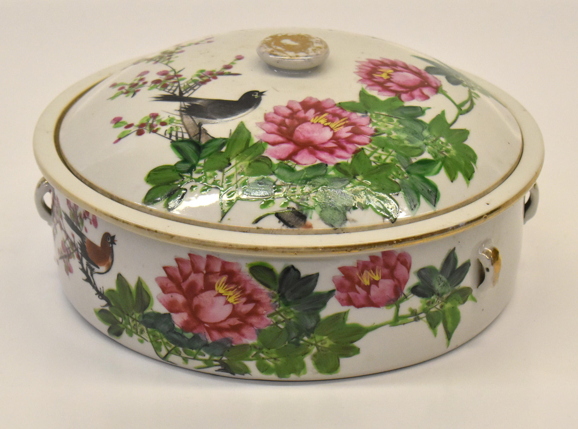 Cina zuppiera in porcellana dipinta con fiori e uccelli