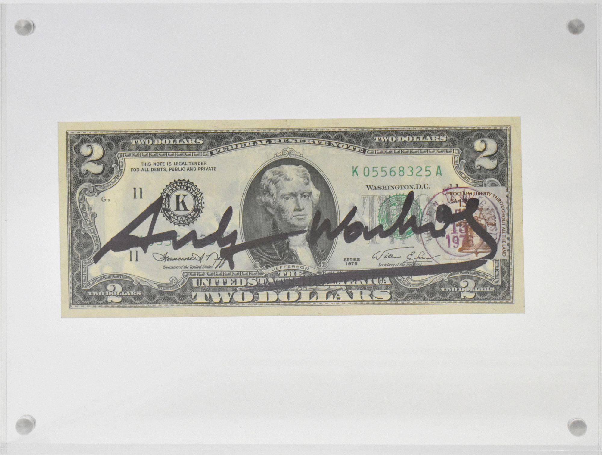 Andy Warhol (1928-1987) banconota da 2 dollari autografata al centro.
