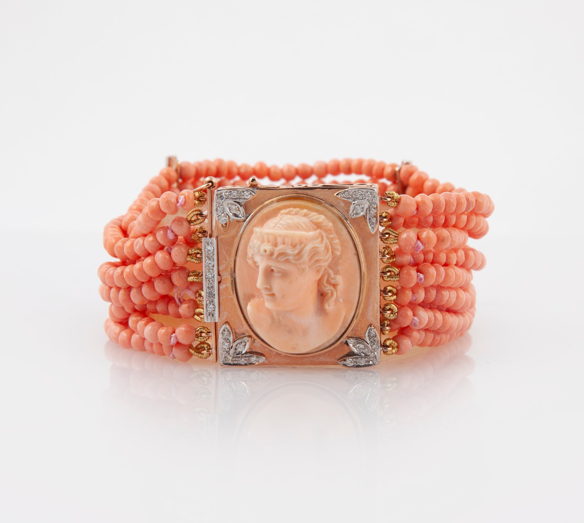 Oro 585/000, diamanti e cammeo. Peso complessivo gr. 45