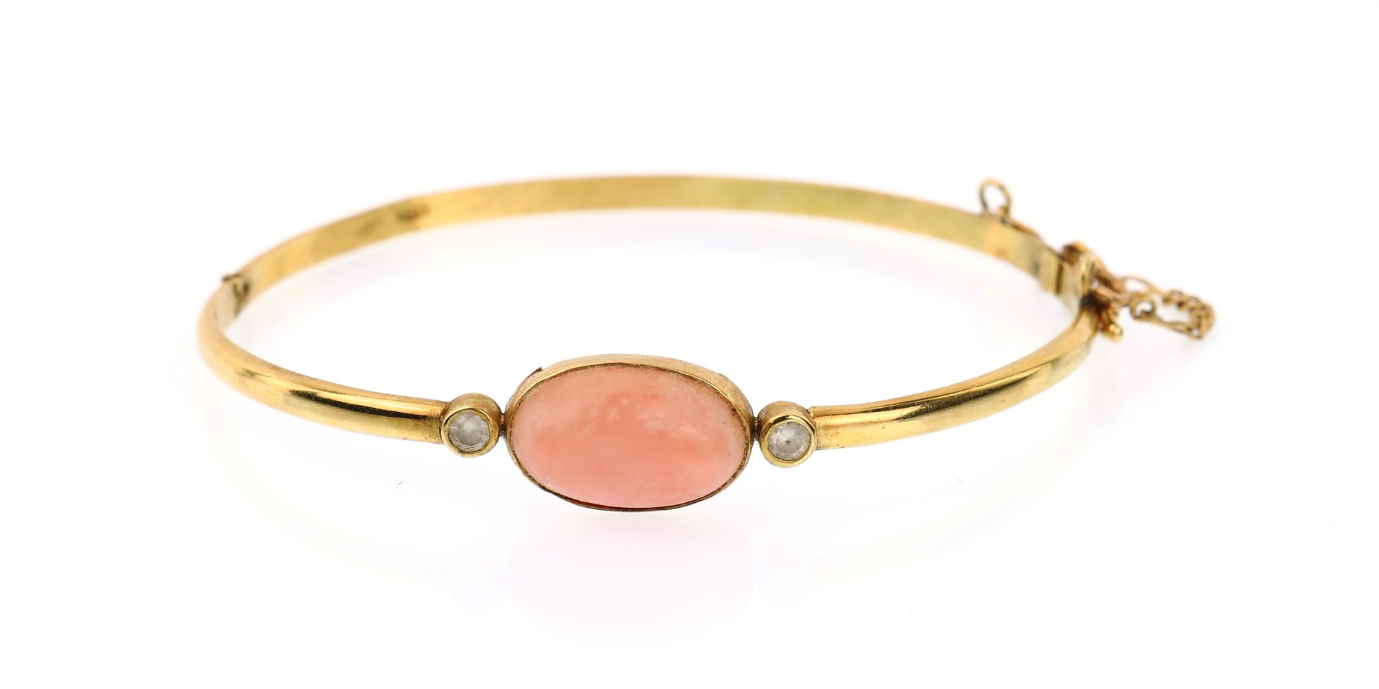 Bracciale rigido in oro e spola di corallo e brillanti polso cm 16,5
