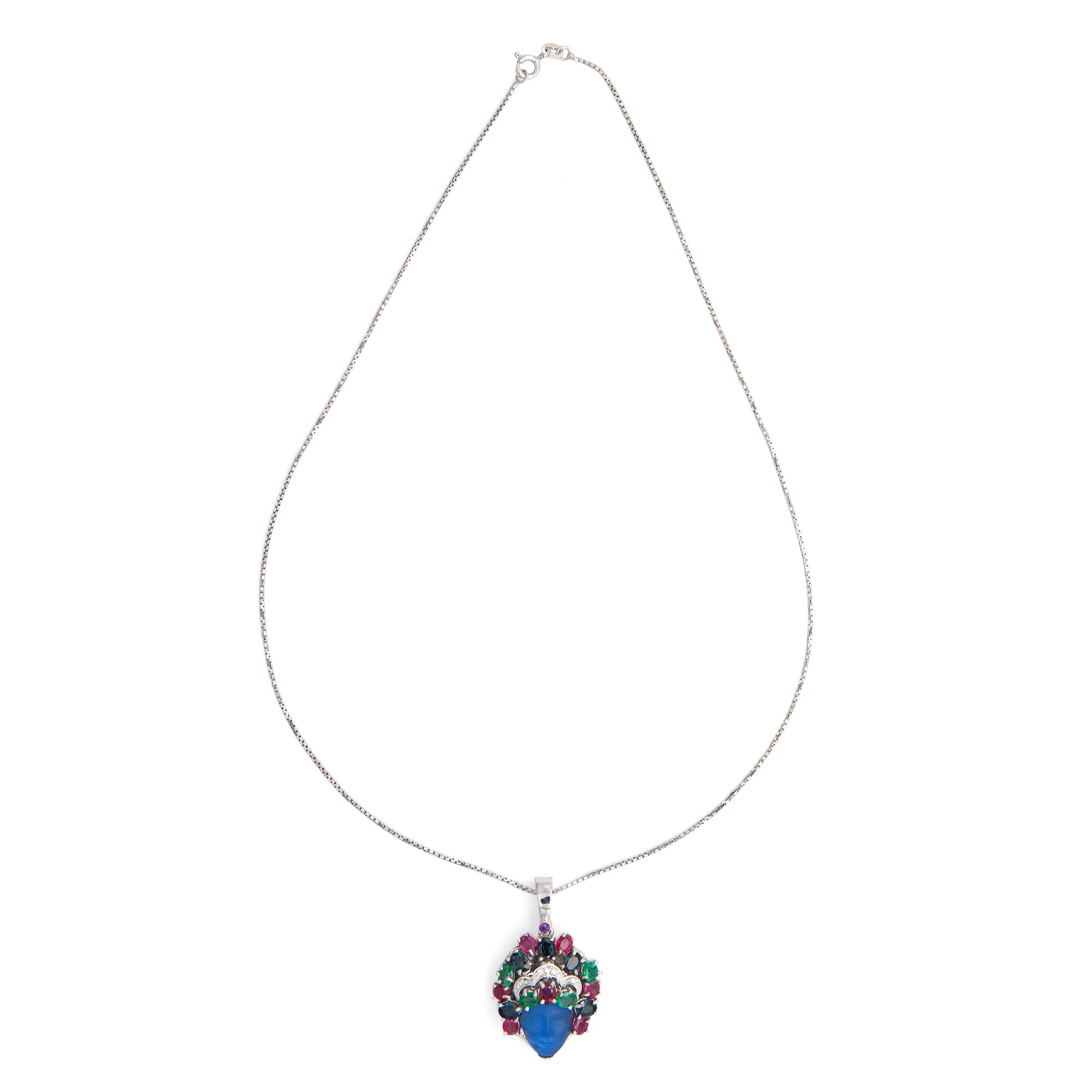 Collana con pendente in oro, brillanti, zaffiri, smeraldi e rubini