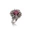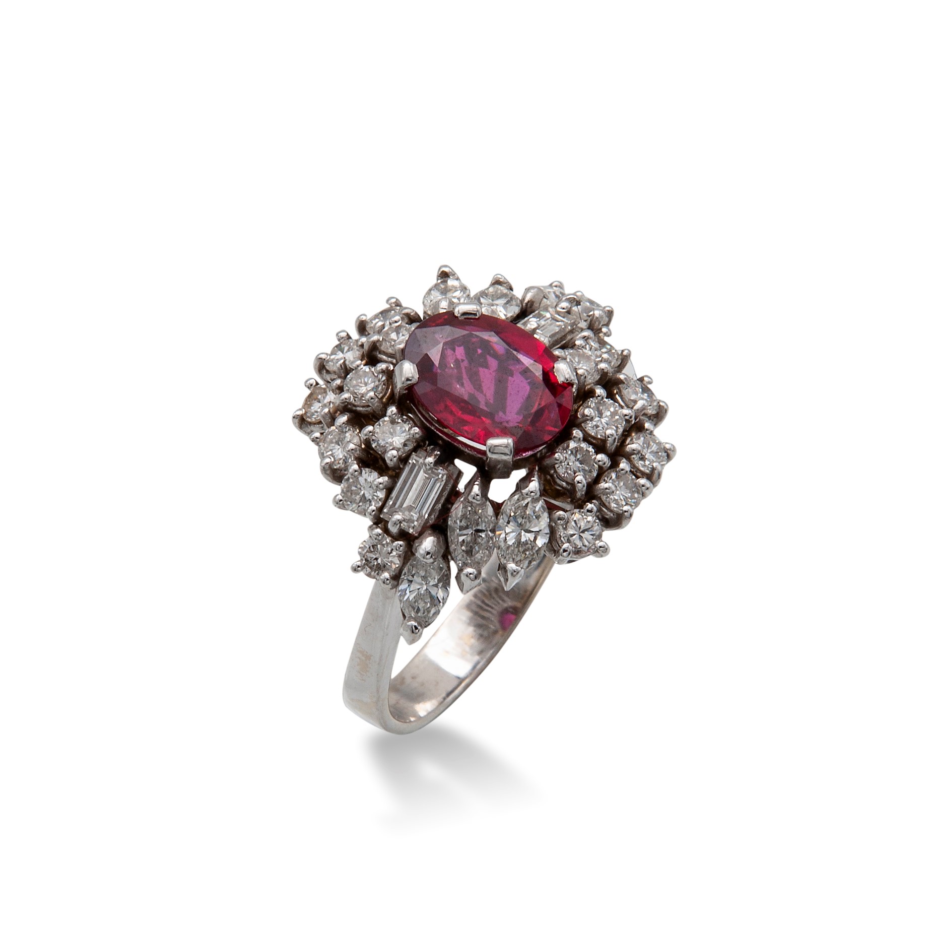 Oro 750/000,Rubino taglio ovale ct 1,40 circa, brillanti taglio rotondo navette e baguettes ct.1,10 circa, prob G/H - VVS/VS. Corredato di certificazione gemmologica.