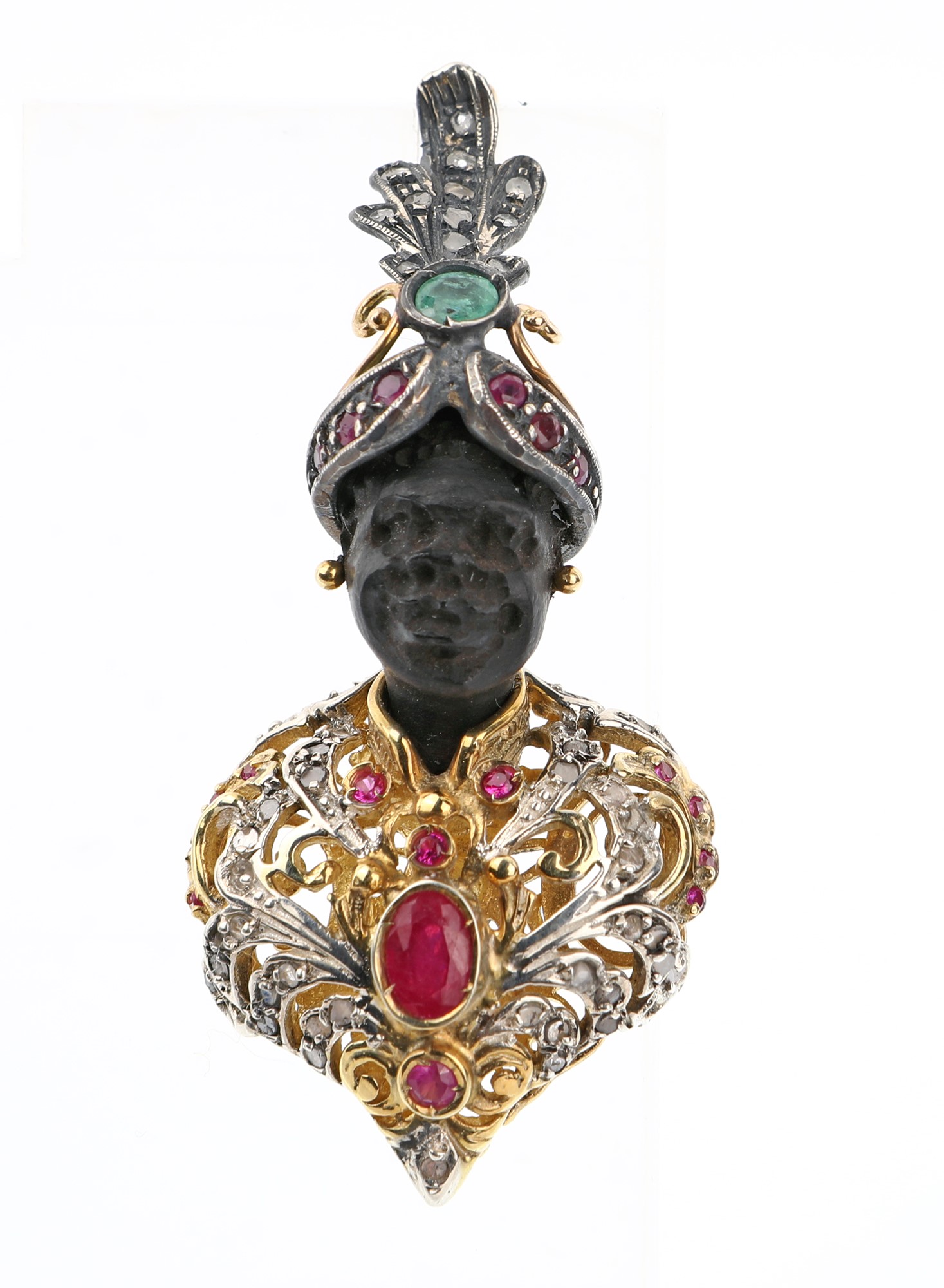 Pendente moretto in oro, argento e pietre preziose altezza complessiva cm 6