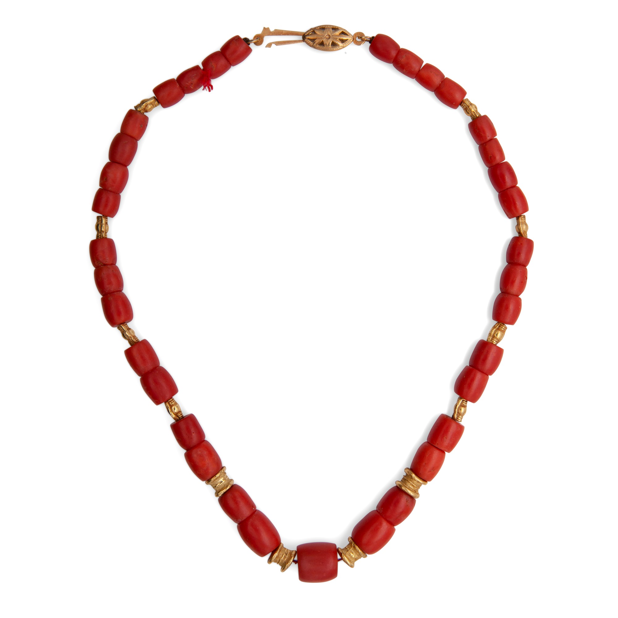Oro giallo 750/000, corallo mediterraneo. Barilotto centrale mm 11. Peso complessivo gr 42.