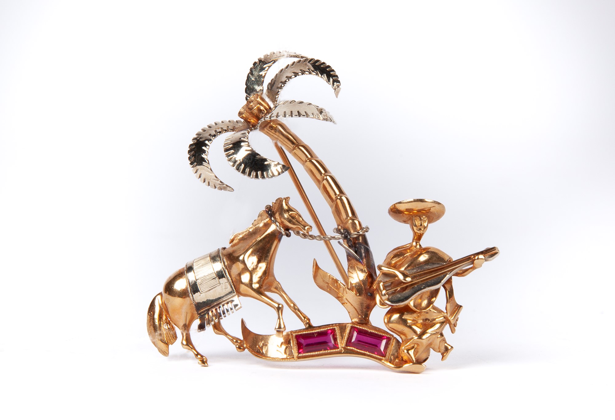 Spilla palma e carretto in oro e pietre rosse cm 5x6