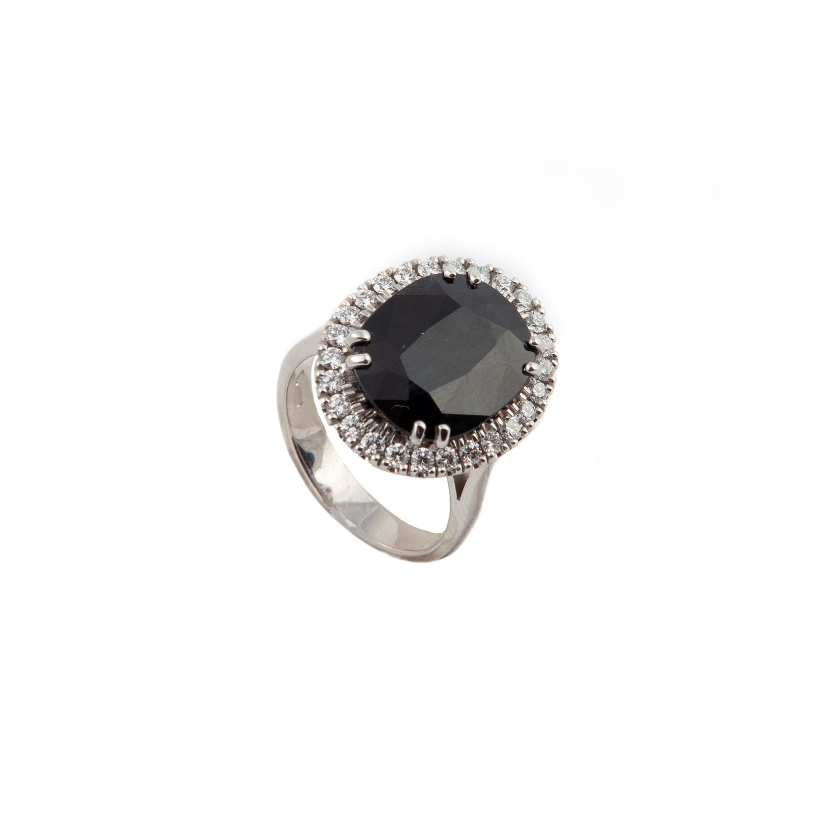 Oro bianco 750/000. Zaffiro naturale taglio ovale ct. 9,50. Diamanti ct. 0,60 circa G VVS. Peso complessivo gr. 9,50.