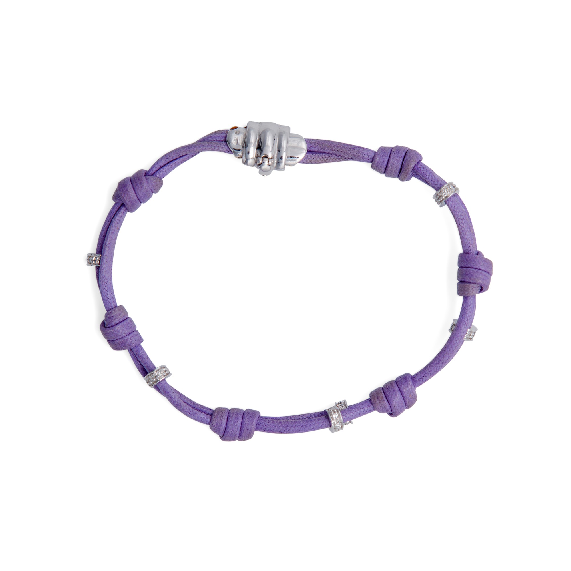 Bracciale in oro bianco e brillanti con laccio in cuoio.