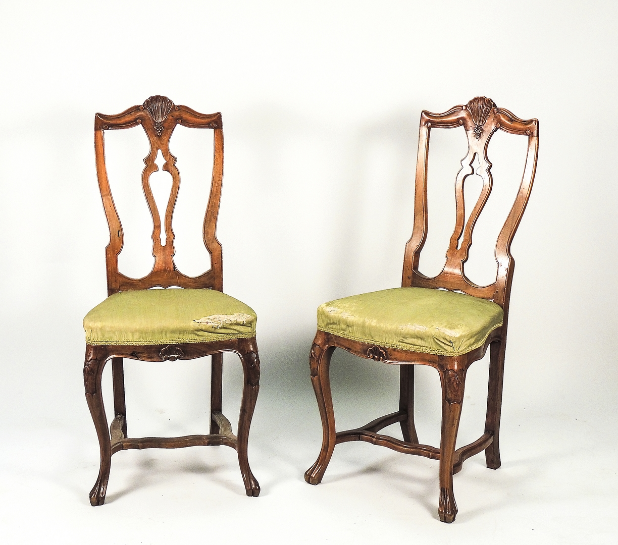 COPPIA DI SEDIE IN NOCE in stile Settecento, spalliera centrata da conchiglia, gambe mosse riunite da crociera, rivestitaein tessuto verde salvia