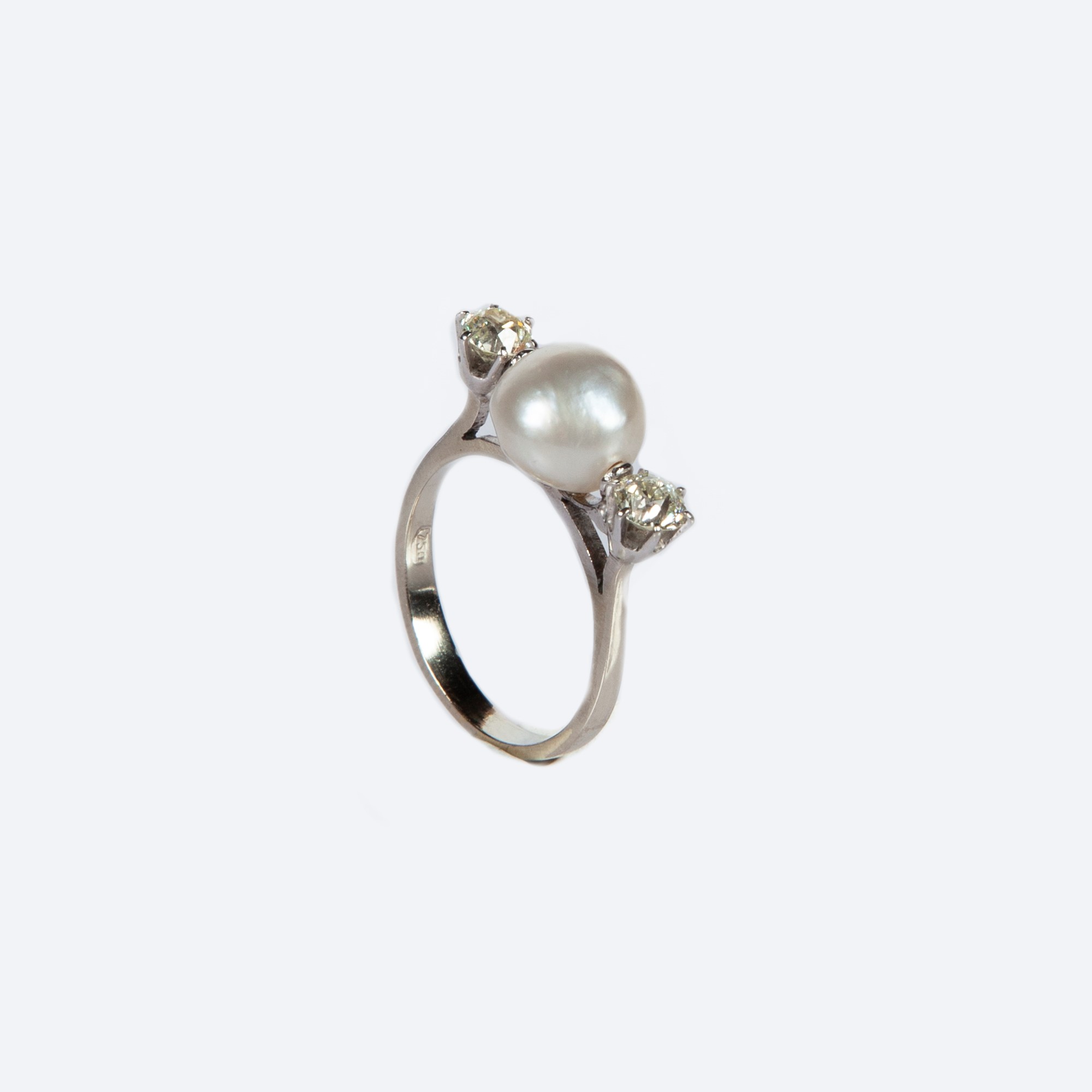 Oro bianco 750/000; due diamanti in taglio vecchia Europa, ct. 0,60 K/L VS/SI. Una perla anucleata spontanea di acqua salata di 8,5 mm. Peso complessivo gr. 3,50.