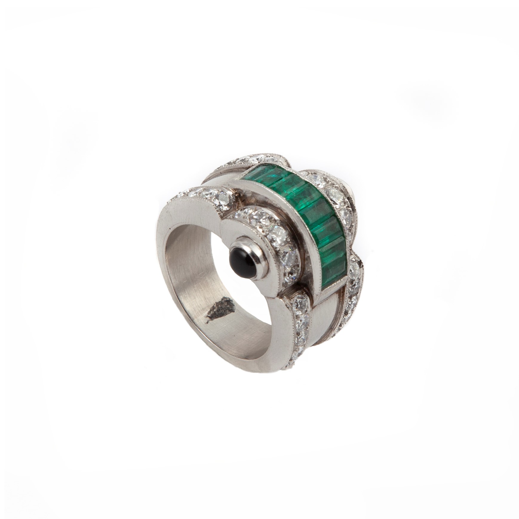 Oro bianco 750/000. Smeraldi in taglio baguettes, diamanti in taglio brillante. Peso complessivo gr. 18,50.