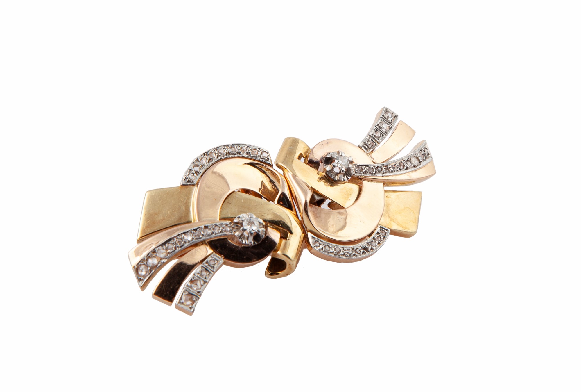 Spilla doppia clipse in oro e brillanti Anni '40 cm 6,5x3