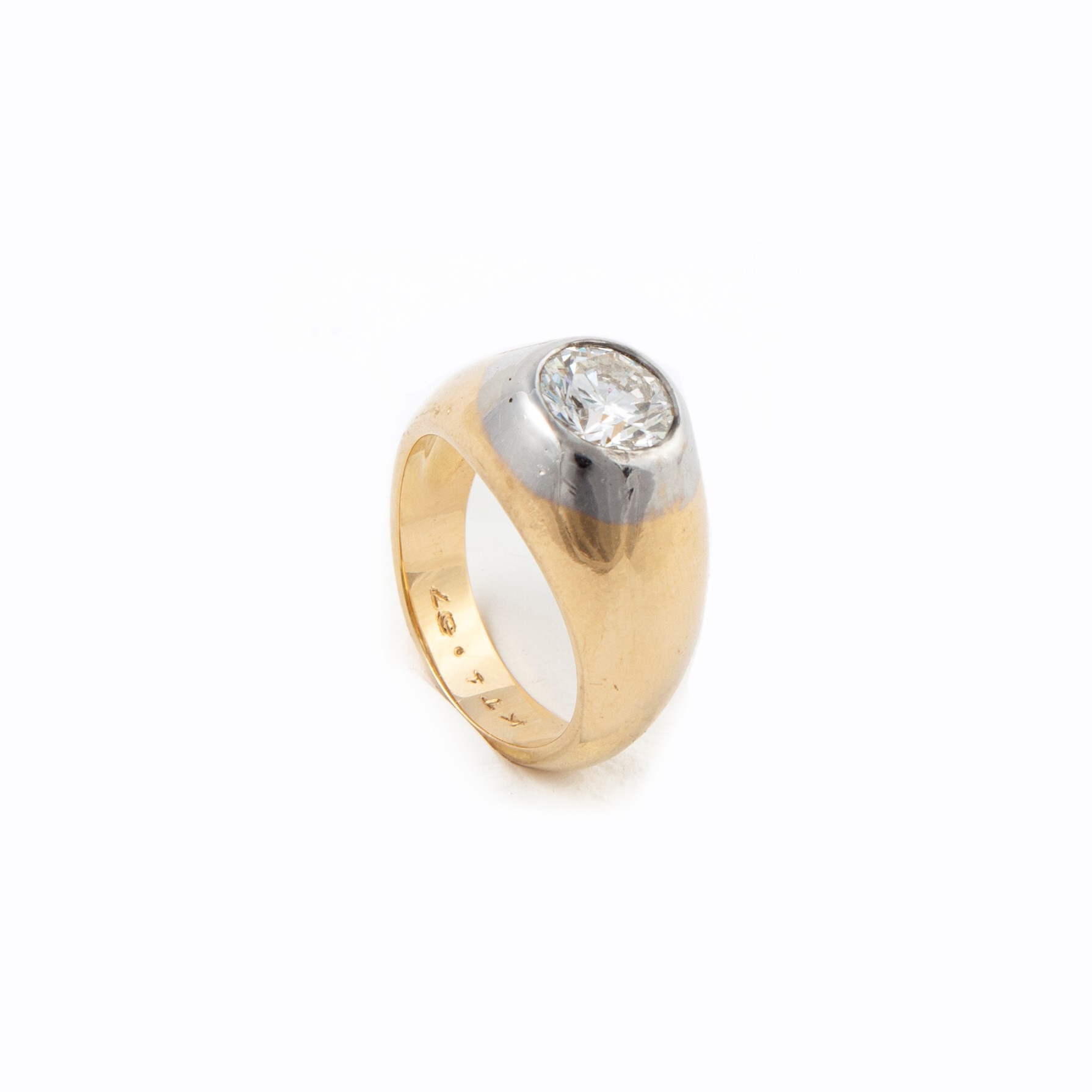 Oro giallo e bianco 750/000. Diamante naturale taglio rotondo brillante, ct. 1,67; prob. I-VSI. Reca all'interno incisione con caratura. Peso complessivo gr. 9,80.