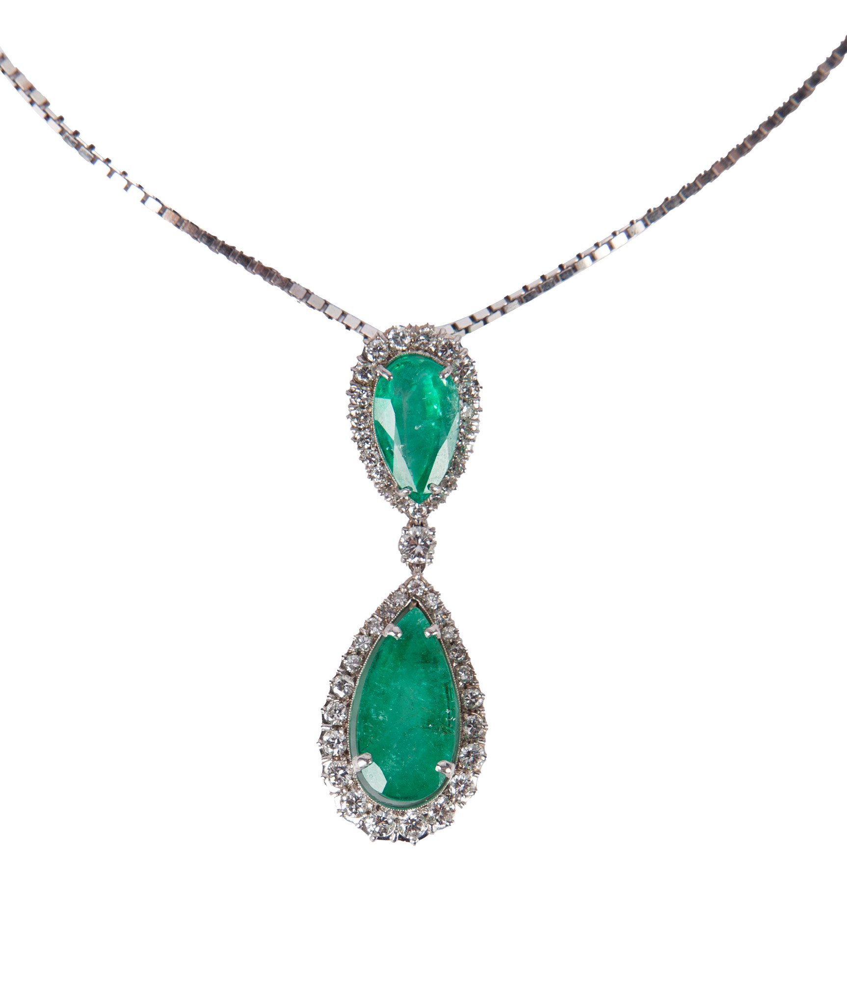 Oro bianco 750/000. Smeraldi naturali in taglio goccia, ct. 6 circa. Diamanti taglio brillante ct. 1,20 circa. Peso complessivo gr. 19,3.