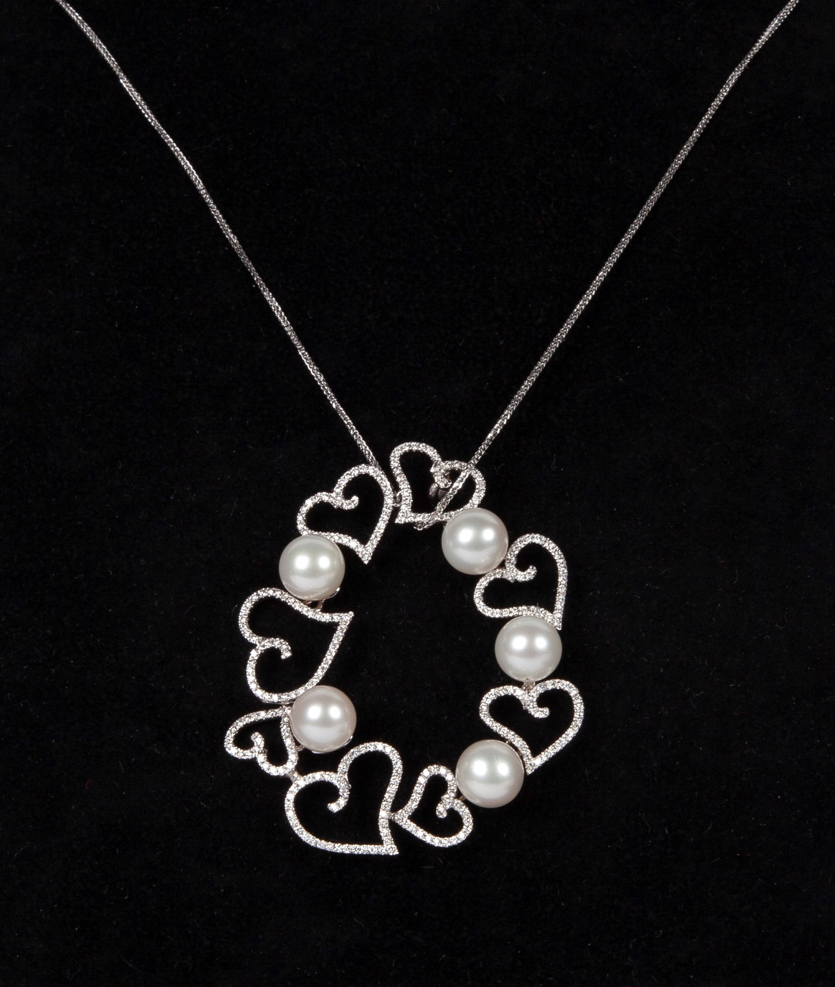 Oro bianco 750/000. Con sottile catena a corda. Pendente con cuori in diamanti taglio brillante di ct. 1,5 ca. alternati e perle coltivate di mm 8,5. Peso complessivo gr. 16.