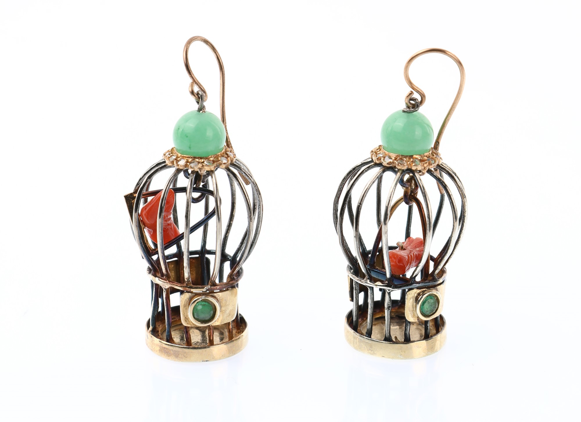 Lotto 299 | Coppia di orecchini a gabbietta, corallo e giada altezza totale cm 5