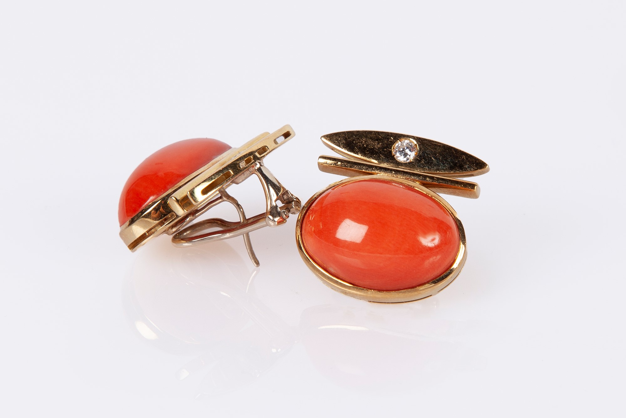 Coppia di orecchini in oro, corallo e brillanti cm 2,5x2,5