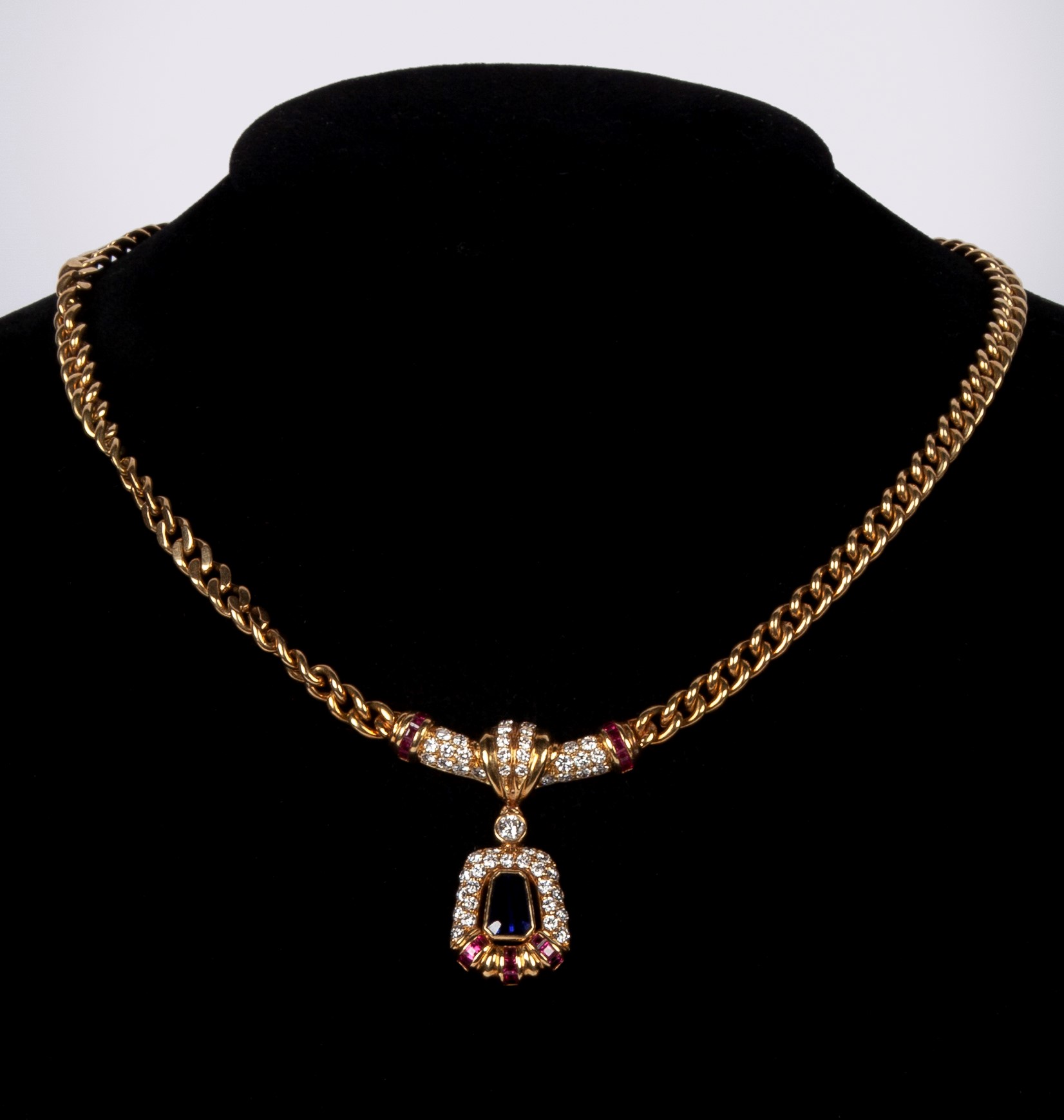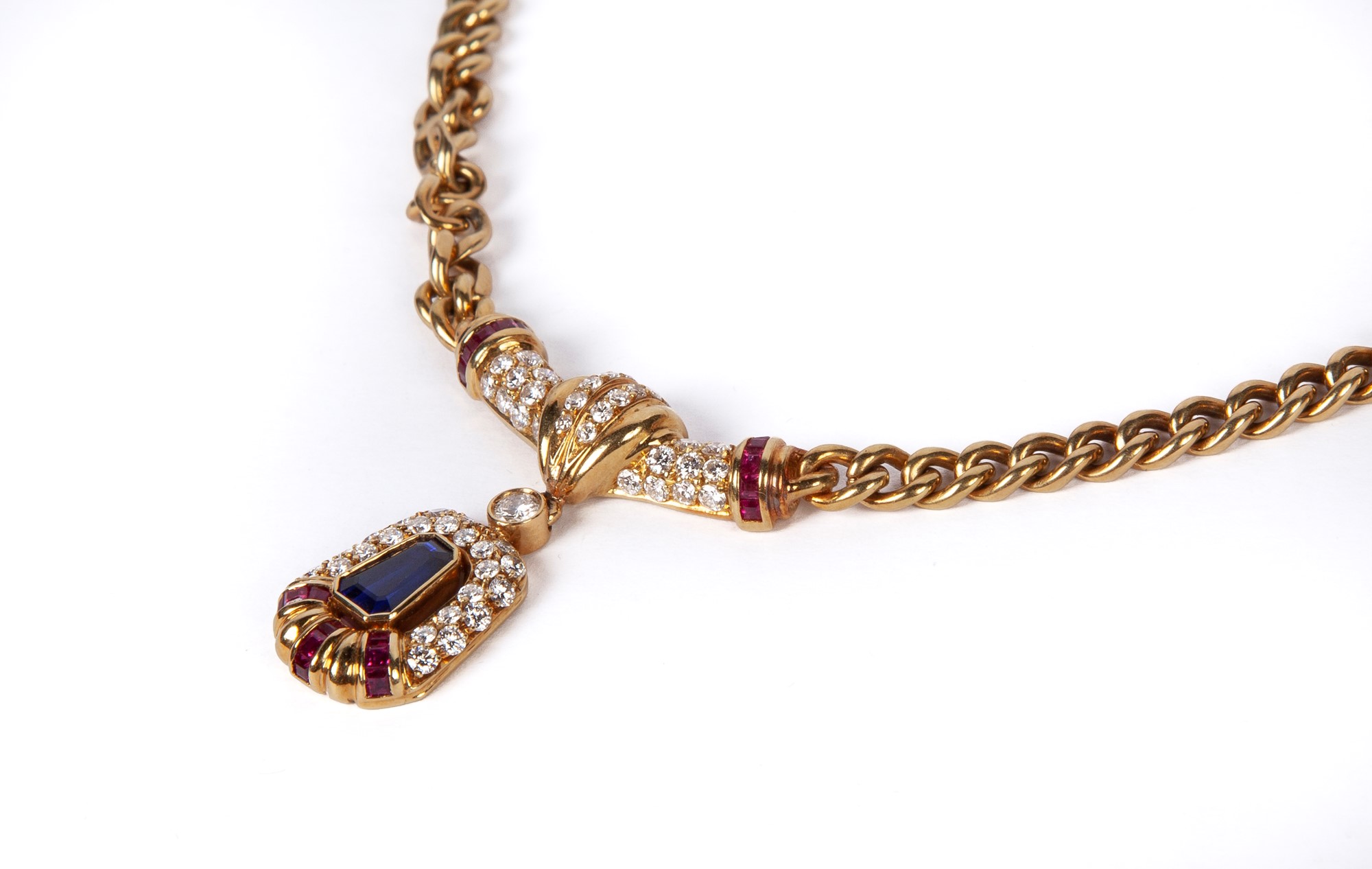 Girocollo in oro giallo, diamanti e pietra blu lunghezza cm 39