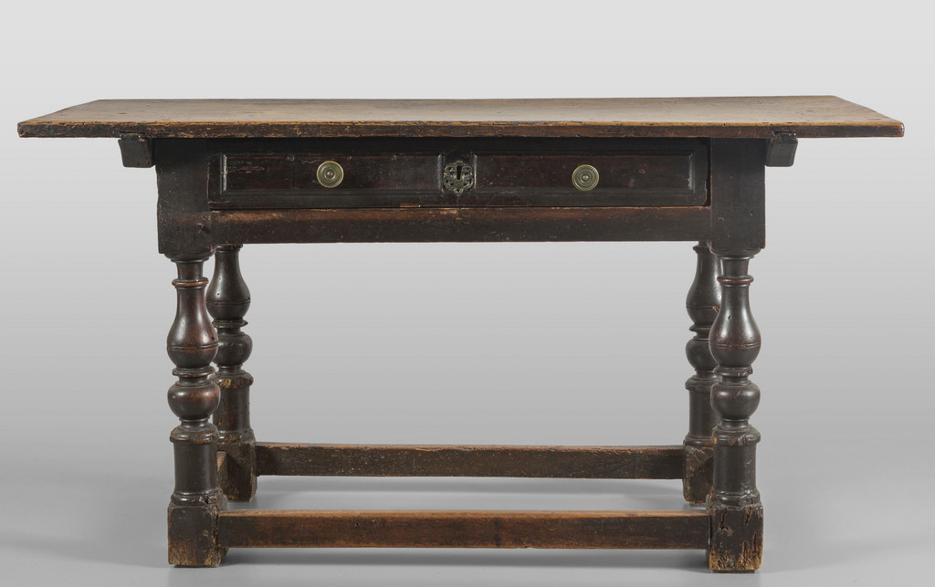 Tavolo da centro in noce gambe a rocchetto raccordate da traverse un cassetto nella fascia Emilia sec.XVII