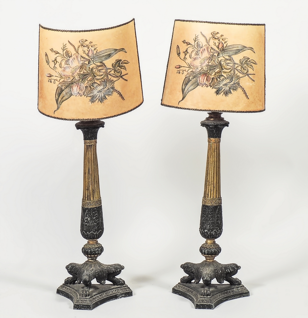 COPPIA DI LUMI DA TAVOLO IN METALLO DORATO E PATINATO fine del XIX/inizio del XX secolo fusto a colonna su tre piedi a zampa ferina, ventole in pergamena dipinta con fiori h cm 90