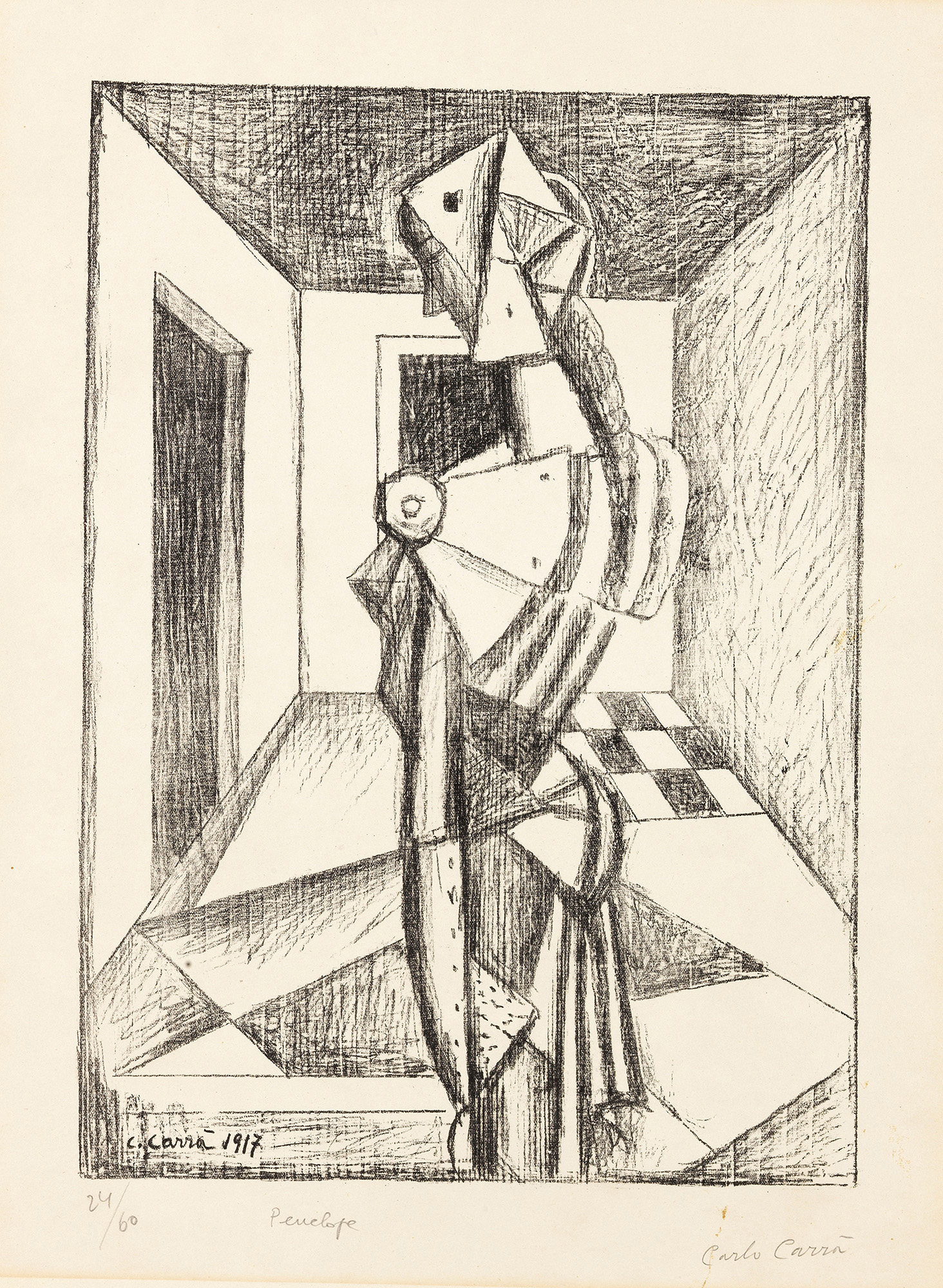 Firma e data in lastra in basso a sinistra: C. Carrà 1917, firma a matita sul margine in basso a destra: Carrà, titolo al centro: Penelope, tiratura in basso a sinistra: 24/60.
