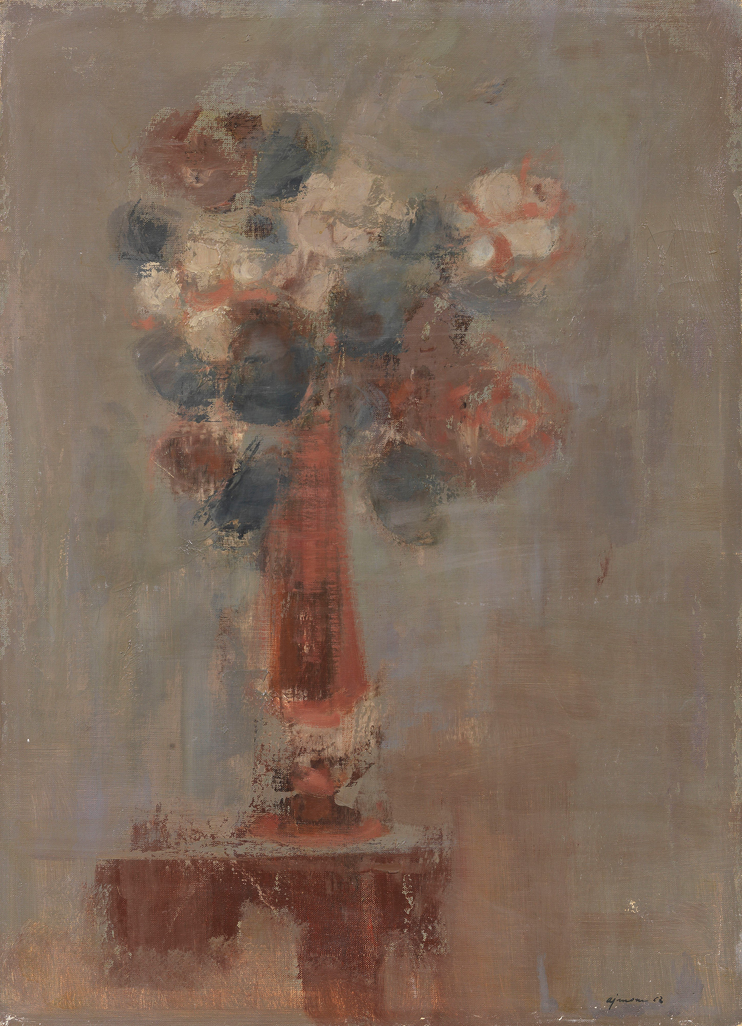 Firma e data in basso a destra: Ajmone 63; titolo e data al verso sulla tela: "Il vaso rosso" / 1963:
