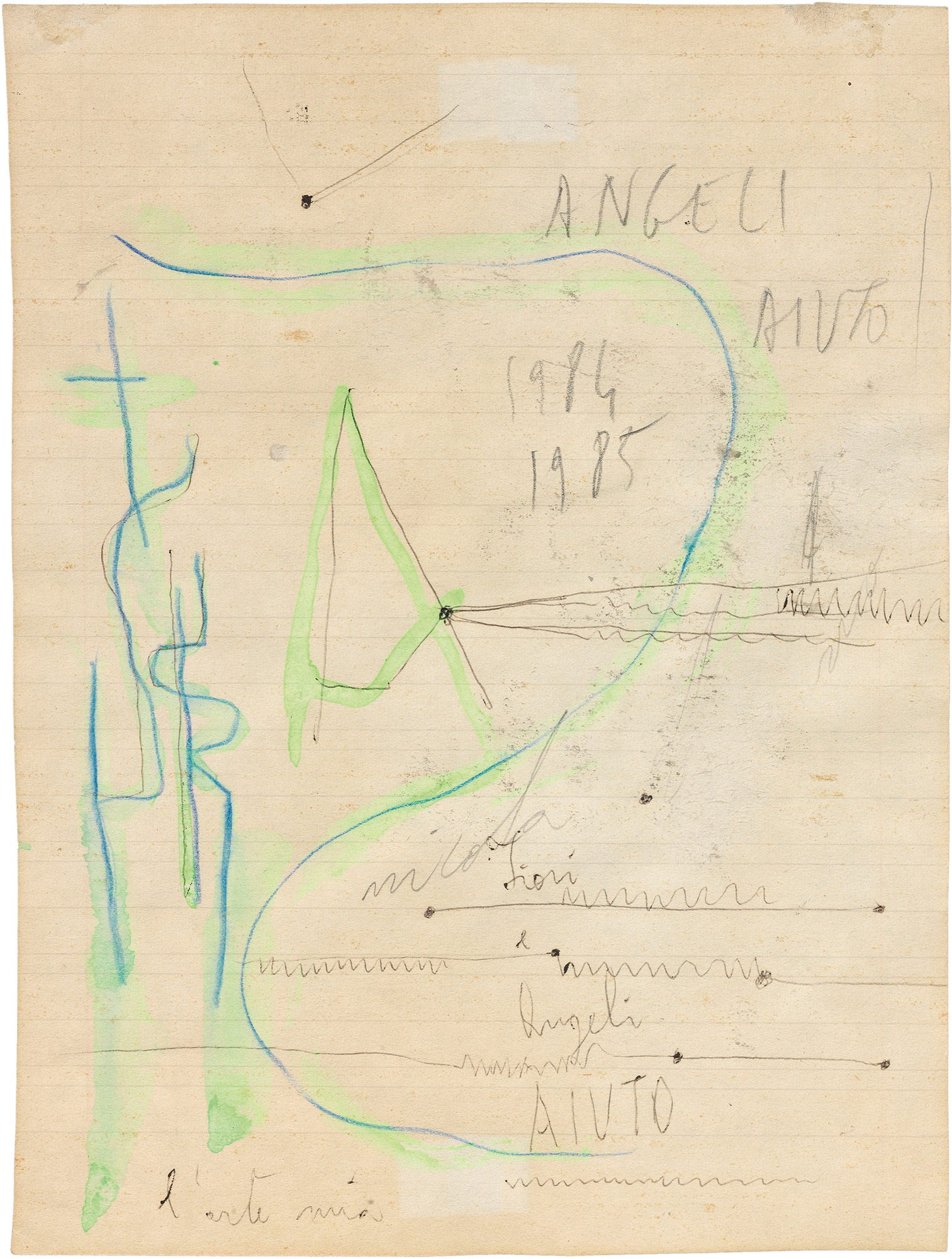 Titolo, scritta e data in alto al centro: Angeli / Aiuto / 1984 / 1985.