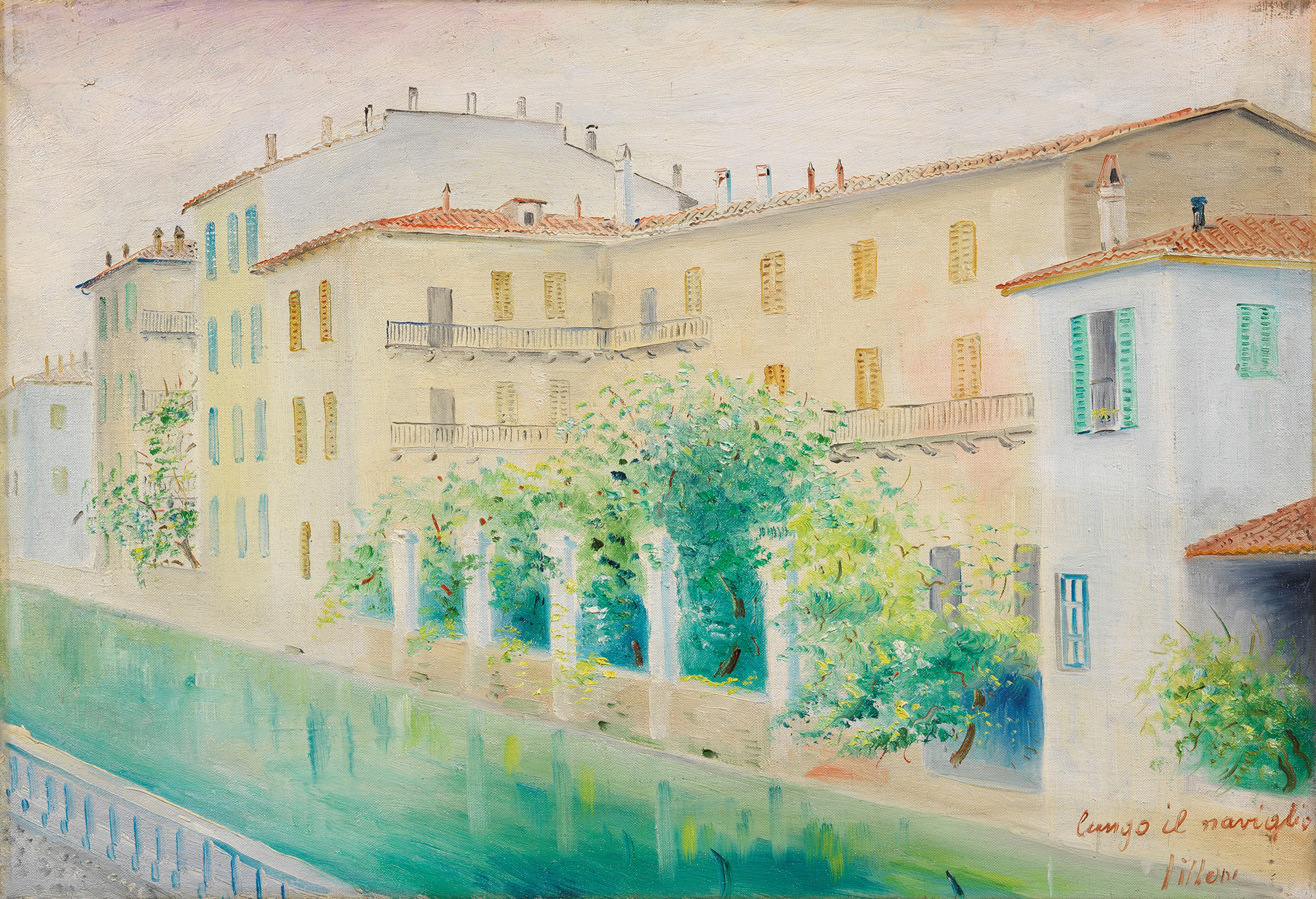 Titolo e firma in basso a destra: Lungo il Naviglio / Lilloni; dedica al verso sulla tela: 1950 / Al pittore Traversi / Cordialmente.