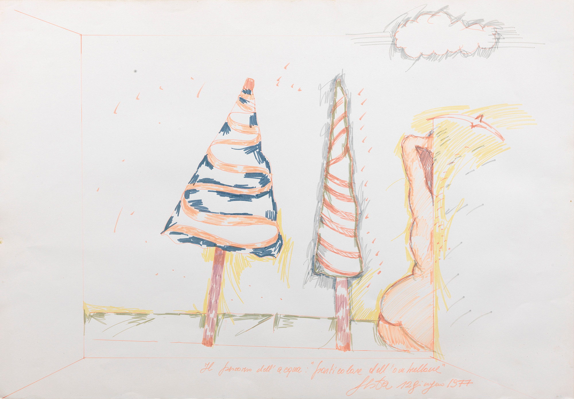 Titolo, firma e data in basso al centro: Il percorso dell'acqua: "particolare dell'ombrellone" / Festa 12 giugno 1977.