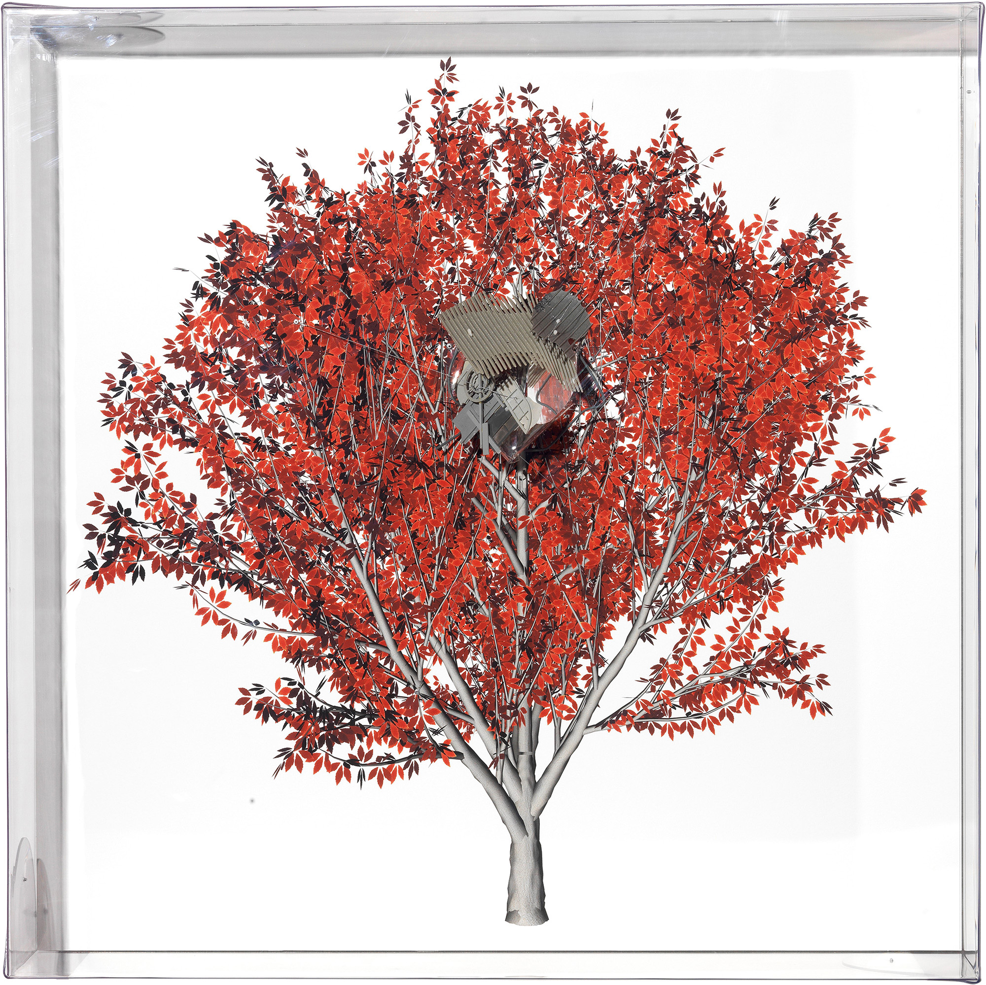 Stampa a colori, tecnica mista e assemblaggio su foglio zincato, in teca