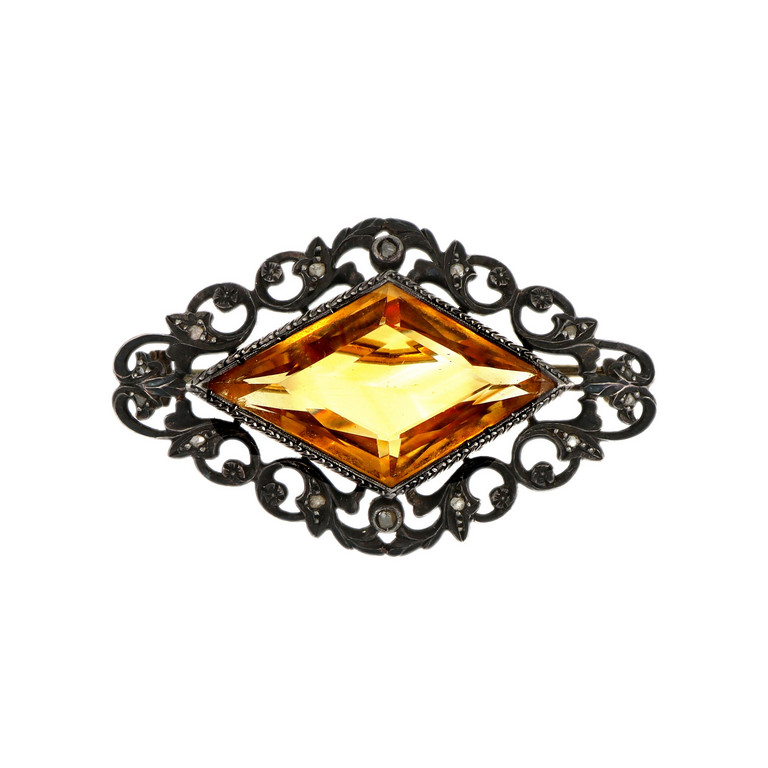Spilla in argento e oro di forma romboidale con grande quarzo giallo arancio al centro e piccoli diamanti sulle volute.