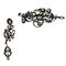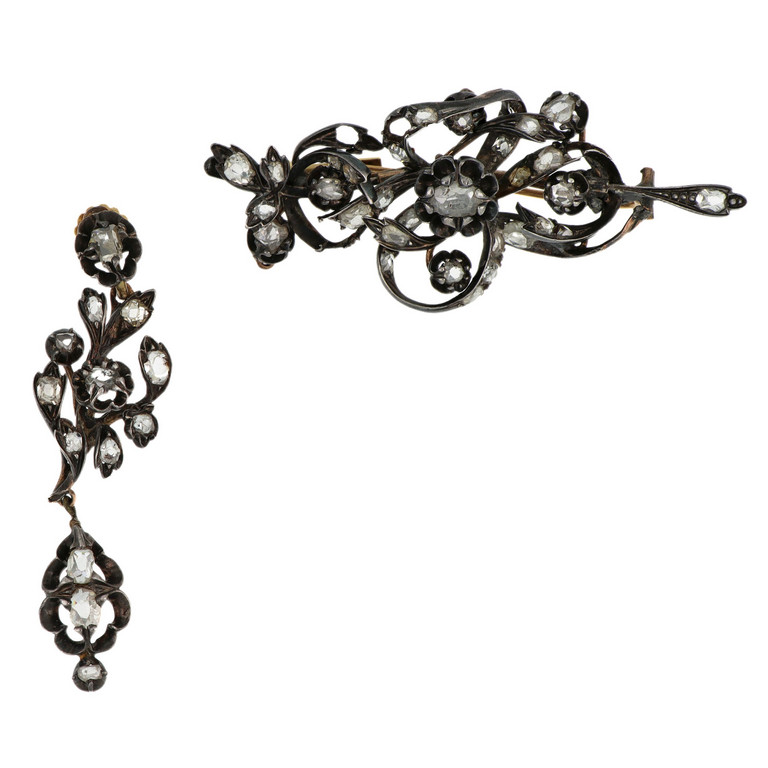 Spilla e orecchino (uno mancante) in argento e oro di basso titolo con diamanti taglio rosa sulle volute di foggia floreale.
