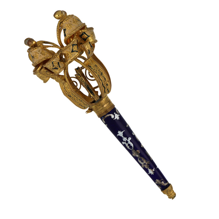 Porta buquet in metallo dorato con smalti blu e inserti in argento nel manico lunghezza cm 12 5.