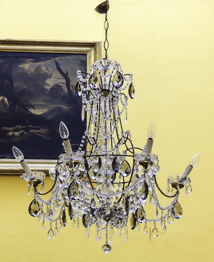 LAMPADARIO IN METALLO rivestito in perle di vetro con catene e pendenti fumè, sei bracci portacandele h cm 98