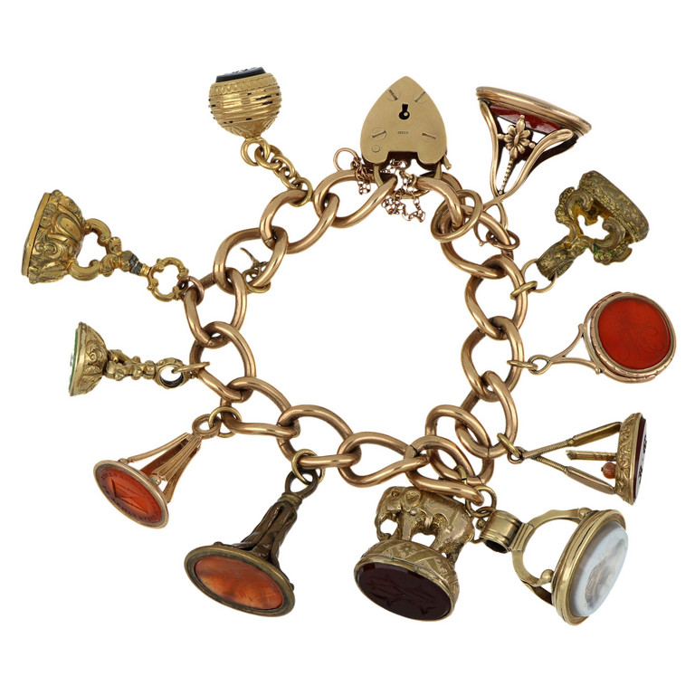 Bracciale in oro basso titolo (prob. 9K) con charms diversi a sigillo e lucchetto con pietre dure incise.