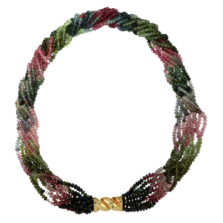 Collana multicolor composta di 9 fili multicolori in pietre naturali semipreziose (prob. tormaline) e fermezza in oro giallo a forma di torciglione pesante.