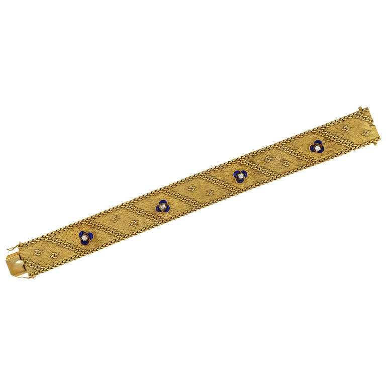 Bracciale in oro giallo a nastro in maglia morbida con smalti blu e piccoli diamanti.